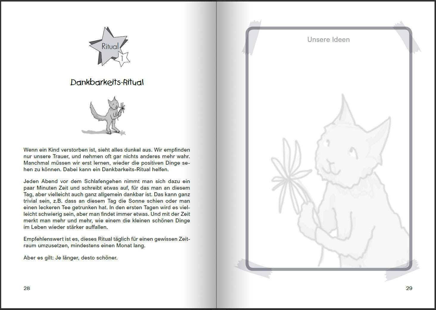 Textauszug Rituale Wenn ein Kind verstirbt, lässt uns das fassungslos und oft auch hilflos zurück. All das, was vorher Alltag war, besteht nicht mehr. Alles ist neu, jeder Atemzug und jeder Schritt muss neu erlernt werden. Wir müssen lernen, mit unserer Trauer und unserem Schmerz zu leben. Gerade wenn eine schwere Krankheit die Ursache war, haben wir mit ansehen müssen, wie unser geliebtes Kind langsam von uns geht. Haben Hilflosigkeit erleben müssen. Angst. Verzweiflung. Oft bleiben Selbstvorwürfe zurück. Und eine unendliche Menge an Fragen. Aber es gibt Wege, diese Fragen loszulassen, die Vorwürfe zum Verstummen zu bringen. Es gibt Wege, das Leben in diesem „neuen Normal“ leichter zu ertragen und wieder zu sich selbst zu finden: mit Ritualen. *** Ritual 1: Dankbarkeits-Ritual Wenn ein Kind verstorben ist, sieht alles dunkel aus. Wir empfinden nur unsere Trauer, und nehmen oft gar nichts anderes mehr wahr. Manchmal müssen wir erst lernen, wieder die positiven Dinge sehen zu können. Dabei kann ein Dankbarkeits-Ritual helfen. Jeden Abend vor dem Schlafengehen nimmt man sich dazu ein paar Minuten Zeit und schreibt etwas auf, für das man an diesem Tag, aber vielleicht auch ganz allgemein dankbar ist. Das kann ganz trivial sein, z.B. dass an diesem Tag die Sonne schien oder man einen leckeren Tee getrunken hat. In den ersten Tagen wird es vielleicht schwierig sein, aber man findet immer etwas. Und mit der Zeit merkt man mehr und mehr, wie einem die kleinen schönen Dinge im Leben wieder stärker auffallen. Empfehlenswert ist es, dieses Ritual täglich für einen gewissen Zeitraum umzusetzen, mindestens einen Monat lang. Aber es gilt: Je länger, desto schöner. Unsere Ideen: … *** Ritual 2: Ritual des Topfes voller Glück Dieses Ritual schließt sich an das Dankbarkeits-Ritual an. Jedes Mal, wenn einem etwas besonders Schönes passiert, nimmt man sich einen kleinen Zettel und notiert das Positive. Man faltet ihn zusammen und steckt ihn in ein Gefäß. Das kann schön gestaltet sein oder aber ganz einfach. Am Ende des Jahres, vielleicht an Weihnachten, vielleicht an Silvester, nimmt man sich diesen Topf voller Glück und öffnet ihn mit der ganzen Familie (oder auch nur für sich selbst). Dieses Ritual schenkt einen positiven Jahresrückblick und kann vielleicht Vorfreude auf das nächste Jahr machen. Unsere Ideen: … *** Ritual 3: Ritual der brennenden Kerzen Manchen Familien hilft es, jeden Abend eine Kerze für das fehlende Kind anzuzünden. Beispielsweise beim Abendessen, als Symbol dafür, dass das verstorbene Kind trotzdem dabei ist. Zusätzlich kann es schön sein, zu besonderen Anlässen, die der Familie wichtig sind, eine große Kerze den ganzen Tag über brennen zu lassen, sodass das Kind symbolisch bei diesem wichtigen Ereignis mit dabei ist. Diese großen Kerzen kann man, wenn man mag, vorher gemeinsam mit farbigem Wachs gestalten, zum Beispiel mit dem Namen des Kindes, Bildern von Dingen, die es gern mochte, oder durch die sich die Familie an das Kind erinnert fühlt. Unsere Ideen: … *** Ritual 4: Ritual der positiven Gedanken Ritual 5: Ritual der Feier des Lebens Ritual 6: Ritual der Bilder Ritual 7: Ritual des Loslassens Ritual 8: Ritual der Briefe Ritual 9: Ritual des Verschließens Ritual 10: Ritual des Helfens Ritual 11: Ritual der Reise um die Welt