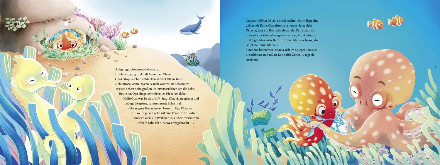 Oktavia Oktopus hat viele schöne Sachen, teilen allerdings ist nicht gerade ihre Stärke. Kalle Krebs hingegen könnte großzügiger nicht sein - es macht ihm viel Freude, mit anderen zu teilen. Nur sein Kugelfisch-Kuscheltier, das braucht er für sich, sonst kann er nicht einschlafen. Als ihm ausgerechnet das abhandenkommt, wächst Oktavia über sich hinaus und schenkt Kalle ihren wertvollsten Besitz. Die aufklappbare Doppelseite in der Mitte zeigt die beiden Protagonisten dieses Wendebuchs und demonstriert: Wir haben alle Dinge, an denen wir hängen, und doch gibt es Situationen, in denen es uns leichtfällt, loszulassen.
