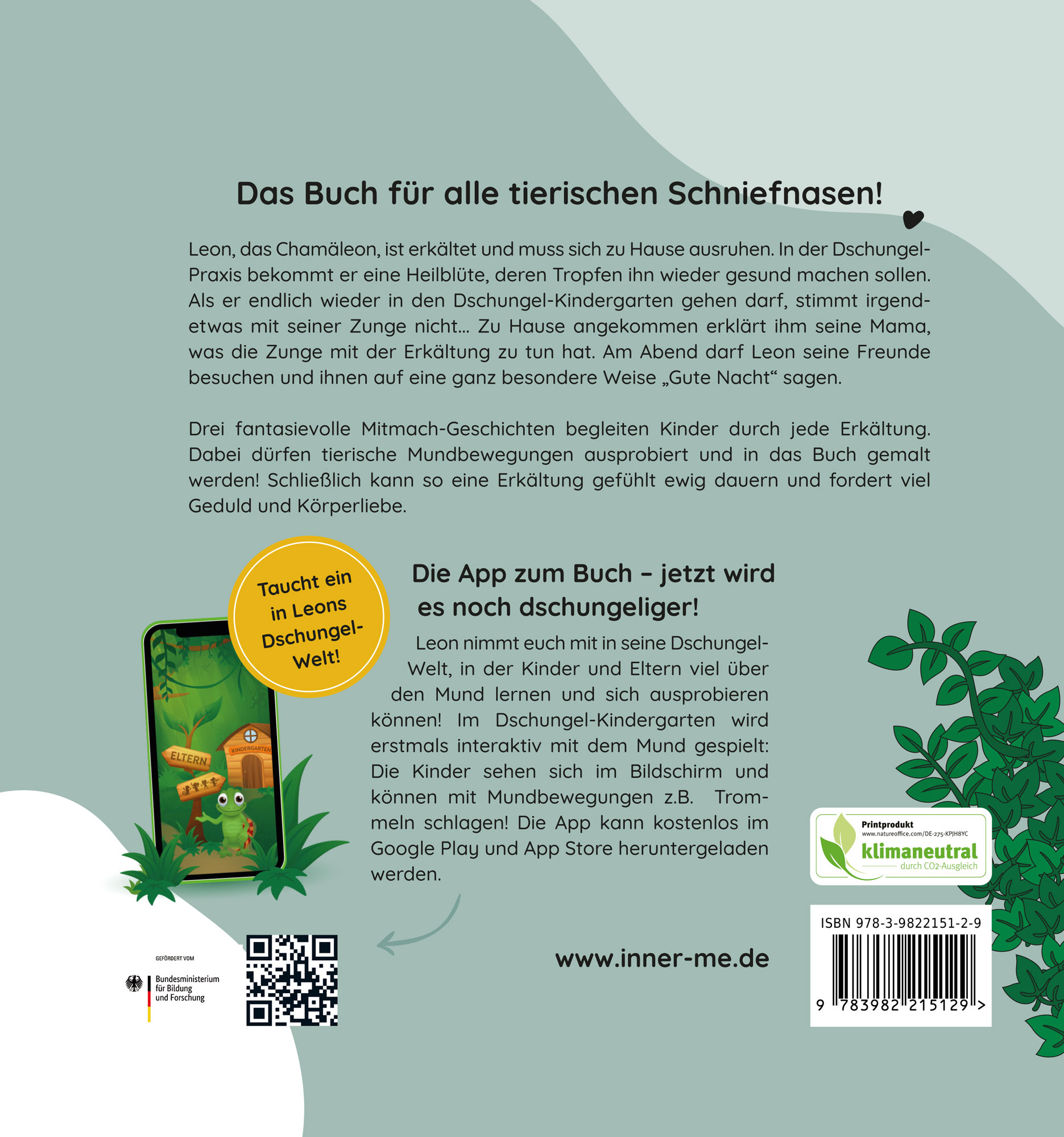 Das Buch für alle tierischen Schniefnasen! Leon, das Chamäleon, und seine Dschungelfreunde begleiten euer Kind durch jede Erkältung – und das Beste ist, es dürfen tierische Mundbewegungen ausprobiert und in das Buch gemalt werden! Schließlich kann so eine Erkältung gefühlt ewig dauern und fordert viel Geduld und Körperliebe. Wie schön wäre es, wenn alle Kinder von klein auf ein gutes Körpergefühl entwickeln können, um auch als Erwachsene auf ihren Körper Acht zu geben. Sich mit dem Körper zu beschäftigen, mit all seinen Gefühlen & Funktionen, wie in diesem Buch die Nasenatmung, ist eine so wichtige Grundlage für das ganze Leben! Also macht es euch gemütlich, lernt mit eurem Kind das Chamäleon Leon und seine Dschungelfreunde kennen und habt viel Spaß beim Lesen, Mitmachen & Ausmalen! Eure Catja