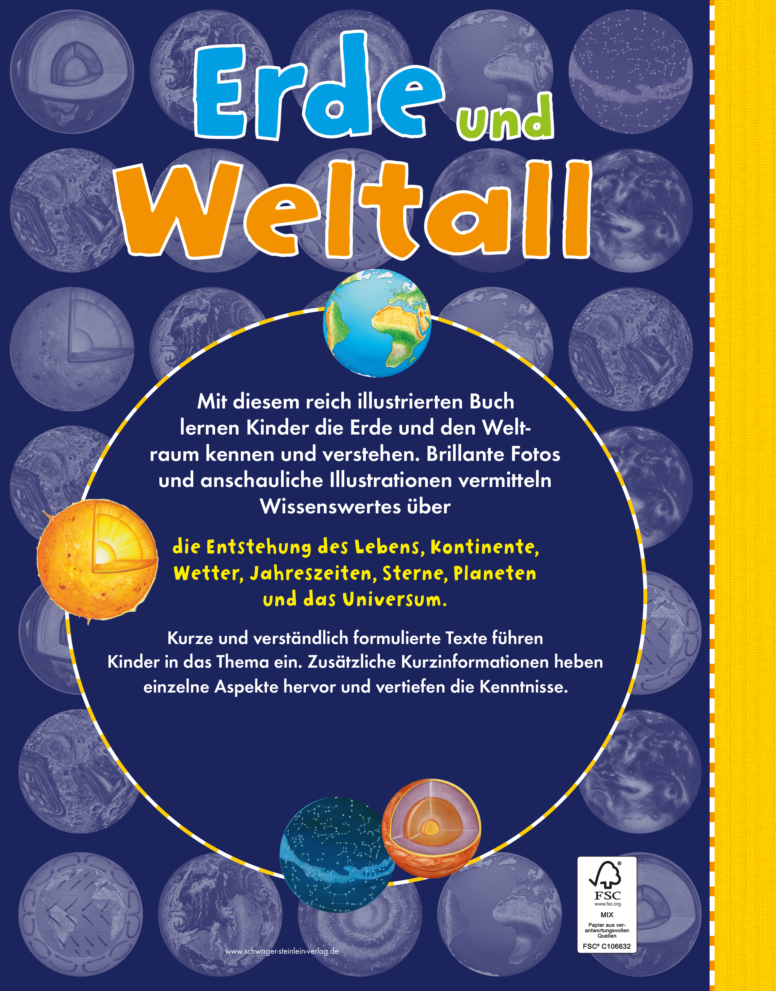Mit diesem reich illustrierten Buch lernen Kinder die Erde und den Weltraum kennen und verstehen. Anschauliche Illustrationen vermitteln Wissenswertes über die Entstehung des Lebens, Kontinente, Wetter, Jahreszeiten, Sterne, Planeten und das Universum. Kurze und verständlich formulierte Texte führen Kinder in das Thema ein. Zusätzliche Kurzinformationen heben einzelne Aspekte hervor und vertiefen die Kenntnisse.