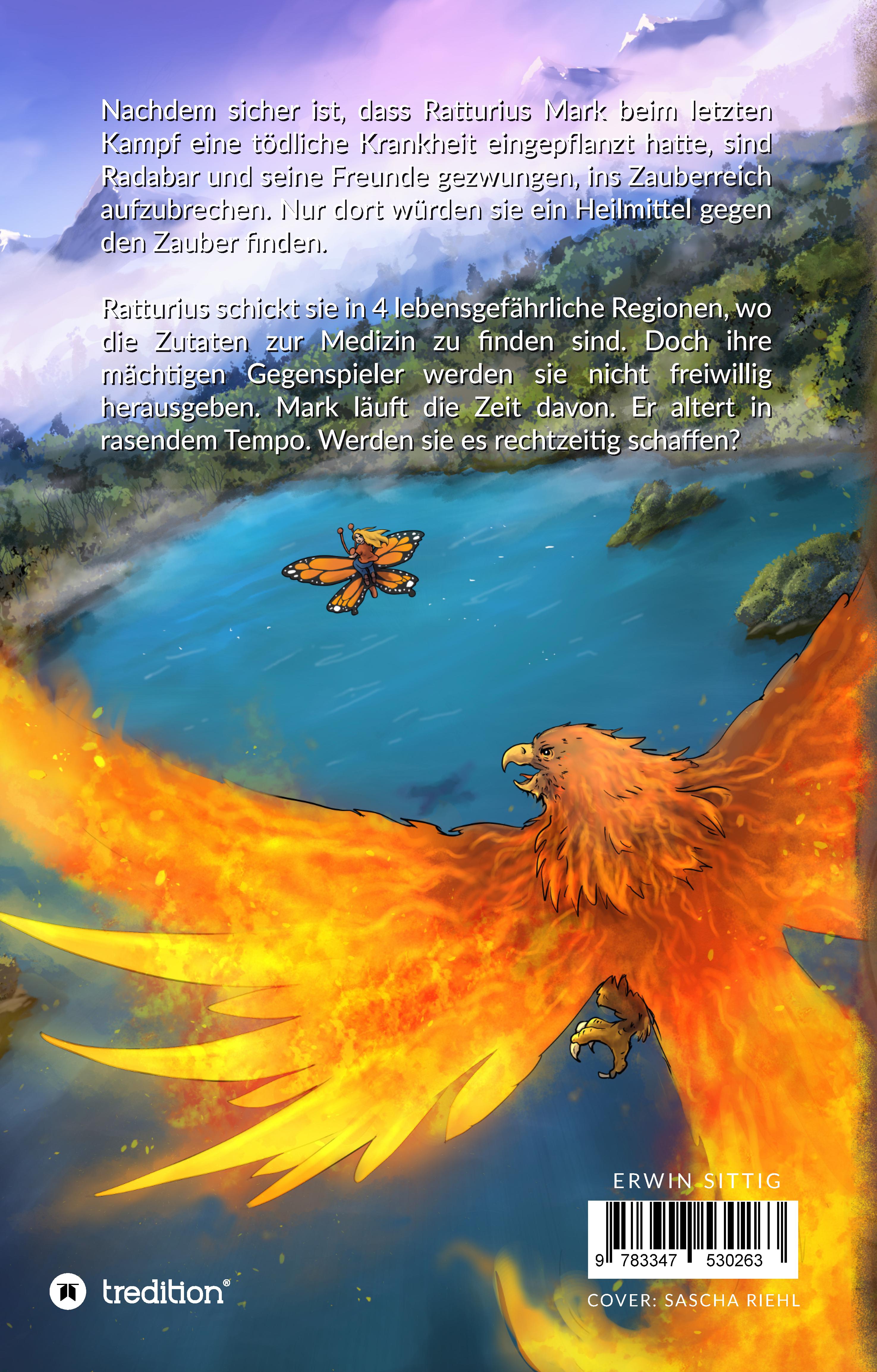 Der Zauberer Radabar, der im ersten Teil ein Zuhause bei Frau Biesing und ihren zwei Söhnen Mark und Claas gefunden hatte, ist nun gezwungen, seine Familie zu retten. Im zweiten Teil hatte er sich schon gegen die bösen Zauberer Ratturius und Tarantella zu wehren. Es kam zum Kampf, in den auch Schulfreunde und ihre Lehrerin mit eingriffen. Im letzten Moment hatte Ratturius einen Zauber auf Mark geschleudert, bevor er sich ins Zauberreich zurückzog. Der Zauber bewirkte, dass Mark sehr schnell alterte. Ihm auch sogar ein Bart, der ihm seine Kraft entzog. Die Freunde sind nun gezwungen, ins Zauberreich zu reisen, um den Zauber rückgängig zu machen. Ratturius gibt ihnen ein Rezept, das Mark heilen kann. Um dieses Medikament herstellen zu können, brauchen sie Zutaten aus vier verschiedenen Regionen des Reiches, die große Gefahren für ihr Leben bereithalten. Doch diese Zutaten sind im Besitz von weiteren bösen Zauberern, die sie niemals freiwillig herausgeben würden. Die Zeit läuft ihnen davon, da Mark immer schneller zu altern scheint. Wenn nur einer von ihnen seine Zutat nicht besorgen kann, wird es um Mark geschehen sein. Es ist jedoch fraglich, ob sie mit ihren Zutaten lebend zurückkehren werden. Können sie der blutrünstigen Pfauentaube eine Feder stehlen, das Salz der Amphida aus dem Sumpf der verlorenen Seelen besorgen und das Erleuchtungswasser im Palast der Verblendeten finden? Und werden sie letztendlich das Gefäß der Millionen Bäche ausfindig machen, in das der gemixte Trank zu füllen ist?