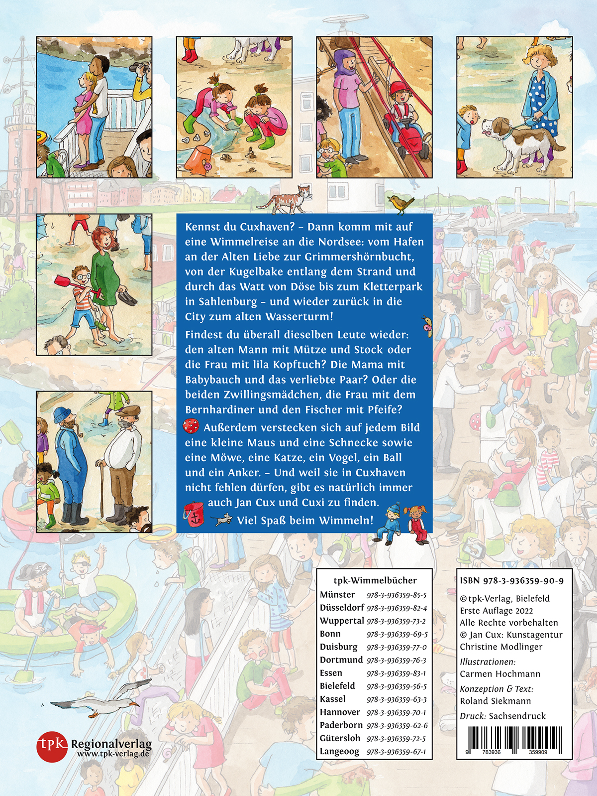 Kennst du Cuxhaven? - Dann komm mit auf eine Wimmelreise an die Nordsee: vom Hafen an der Alten Liebe zur Grimmershörnbucht, von der Kugelbake entlang dem Strand und durch das Watt von Döse bis zum Kletterpark in Sahlenburg - und wieder zurück in die City zum alten Wasserturm!Findest du überall dieselben Leute wieder: den alten Mann mit Mütze und Stock oder die Frau mit lila Kopftuch? Die Mama mit Babybauch und das verliebte Paar? Oder die beiden Zwillingsmädchen, die Frau mit dem Bernhardiner und den Fischer mit Pfeife?Außerdem verstecken sich auf jedem Bild eine kleine Maus und eine Schnecke sowie eine Möwe, eine Katze, ein Vogel, ein Ball und ein Anker. - Und weil sie in Cuxhaven nicht fehlen dürfen, gibt es natürlich immer auch Jan Cux und Cuxi zu finden. Viel Spaß beim Wimmeln!