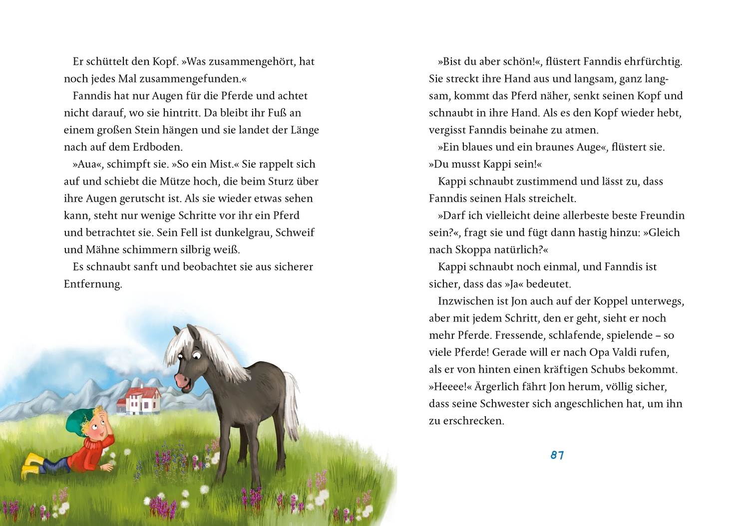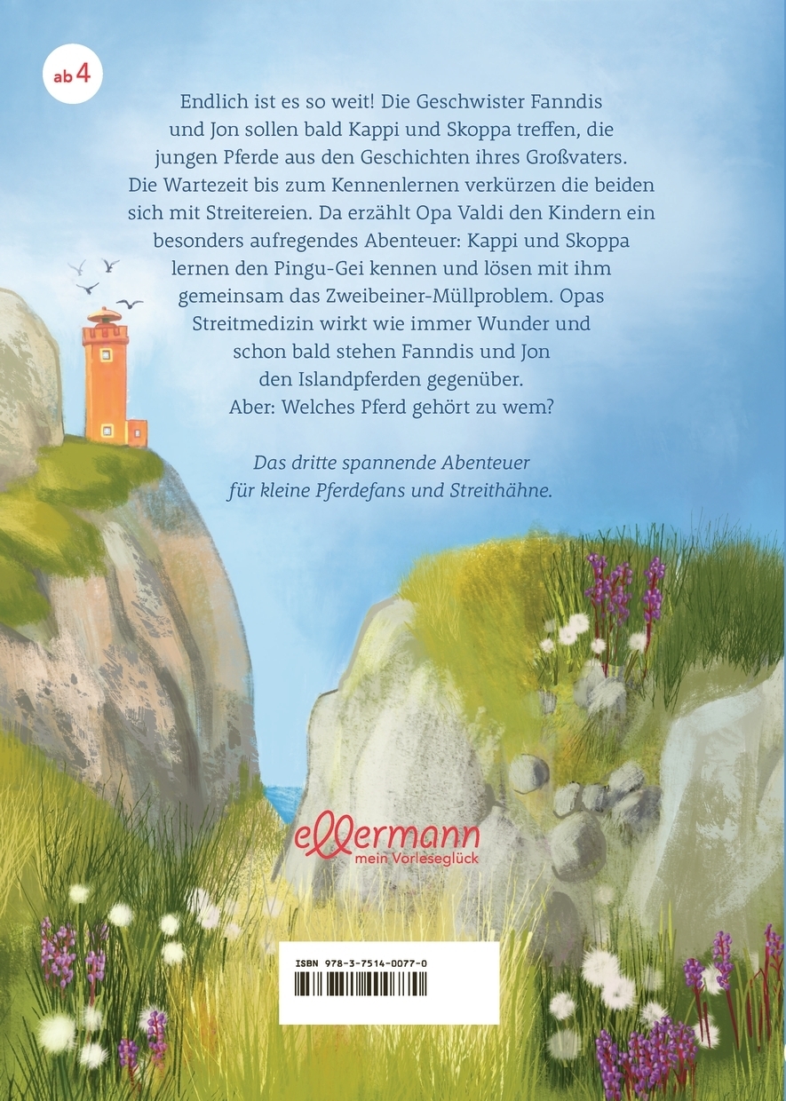 Bald ist es so weit! Fanndis und Jon sollen Kappi und Skoppa, die Helden von Opa Valdis Geschichten, treffen. Doch die Wartezeit birgt viele Möglichkeiten, sich zu streiten, und bevor es endlich losgeht, muss Opa Valdi ein besonders aufregendes Abenteuer erzählen: darüber, wie Kappi und Skoppa den Pingu-Gei kennenlernten und wie sie gemeinsam das Zweibeiner-Müllproblem lösten. Opas Streitmedizin wirkt wie immer Wunder und schon bald stehen die Geschwister Kappi und Skoppa gegenüber. Doch welches Kind gehört eigentlich zu welchem Pony?