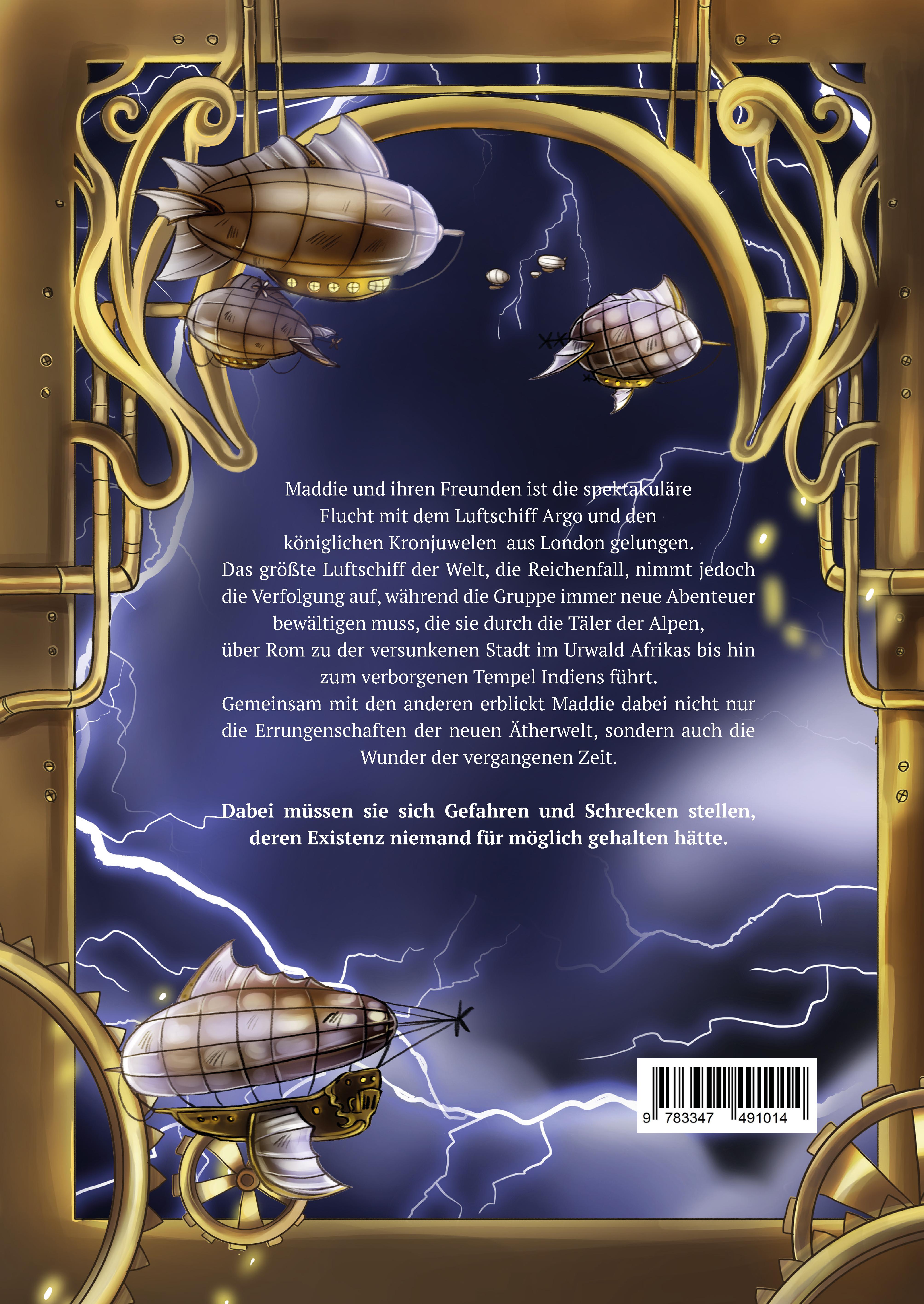 Maddie und ihren Freunden ist die spektakuläre Flucht mit dem Luftschiff Argo und den königlichen Kronjuwelen aus London gelungen. Das größte Luftschiff der Welt, die Reichenfall, nimmt jedoch die Verfolgung auf, während die Gruppe immer neue Abenteuer bewältigen muss, die sie durch die Täler der Alpen, über Rom zu der versunkenen Stadt im Urwald Afrikas bis hin zum verborgenen Tempel Indiens führt. Gemeinsam mit den anderen erblickt Maddie dabei nicht nur die Errungenschaften der neuen Ätherwelt, sondern auch die Wunder der vergangenen Zeit. Dabei müssen sie sich Gefahren und Schrecken stellen, deren Existenz niemand für möglich gehalten hätte.
