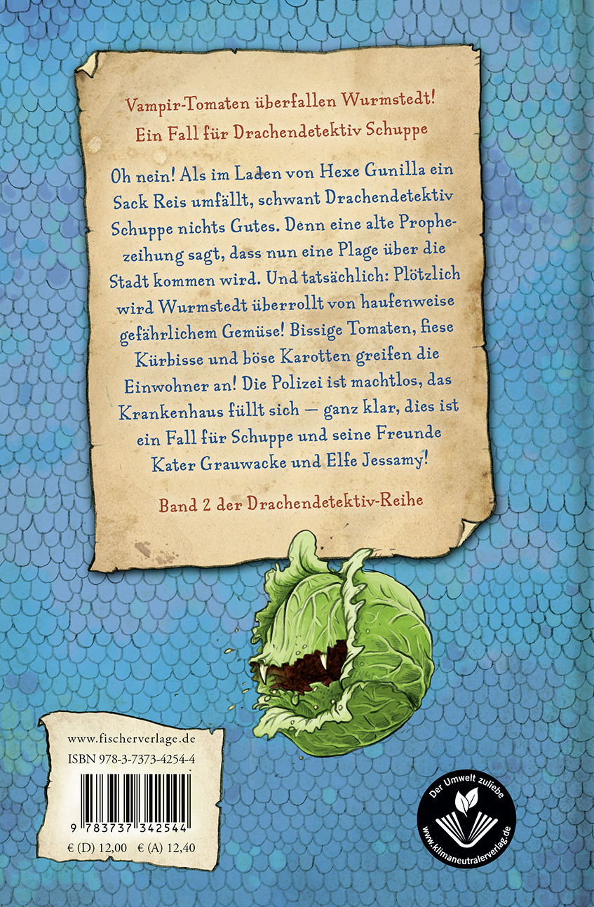 Oh nein! Als im Laden von Hexe Gunilla ein Sack Reis umfällt, schwant Drachendetektiv Schuppe nichts Gutes. Denn eine alte Prophezeiung sagt, dass nun eine Plage über die Stadt kommen wird. Und tatsächlich: Plötzlich wird Wumstedt überrollt von haufenweise gefährlichem Gemüse! Bissige Tomaten, fiese Kürbisse und böse Karotten greifen die Einwohner an! Die Polizei ist machtlos, das Krankenhaus füllt sich - ganz klar, dies ist ein Fall für Schuppe und seine Freunde Kater Grauwacke und Elfe Jessamy! Auf der Suche nach dem Ursprung der Gemüseplage erwarten die drei unglaubliche Überraschungen ...