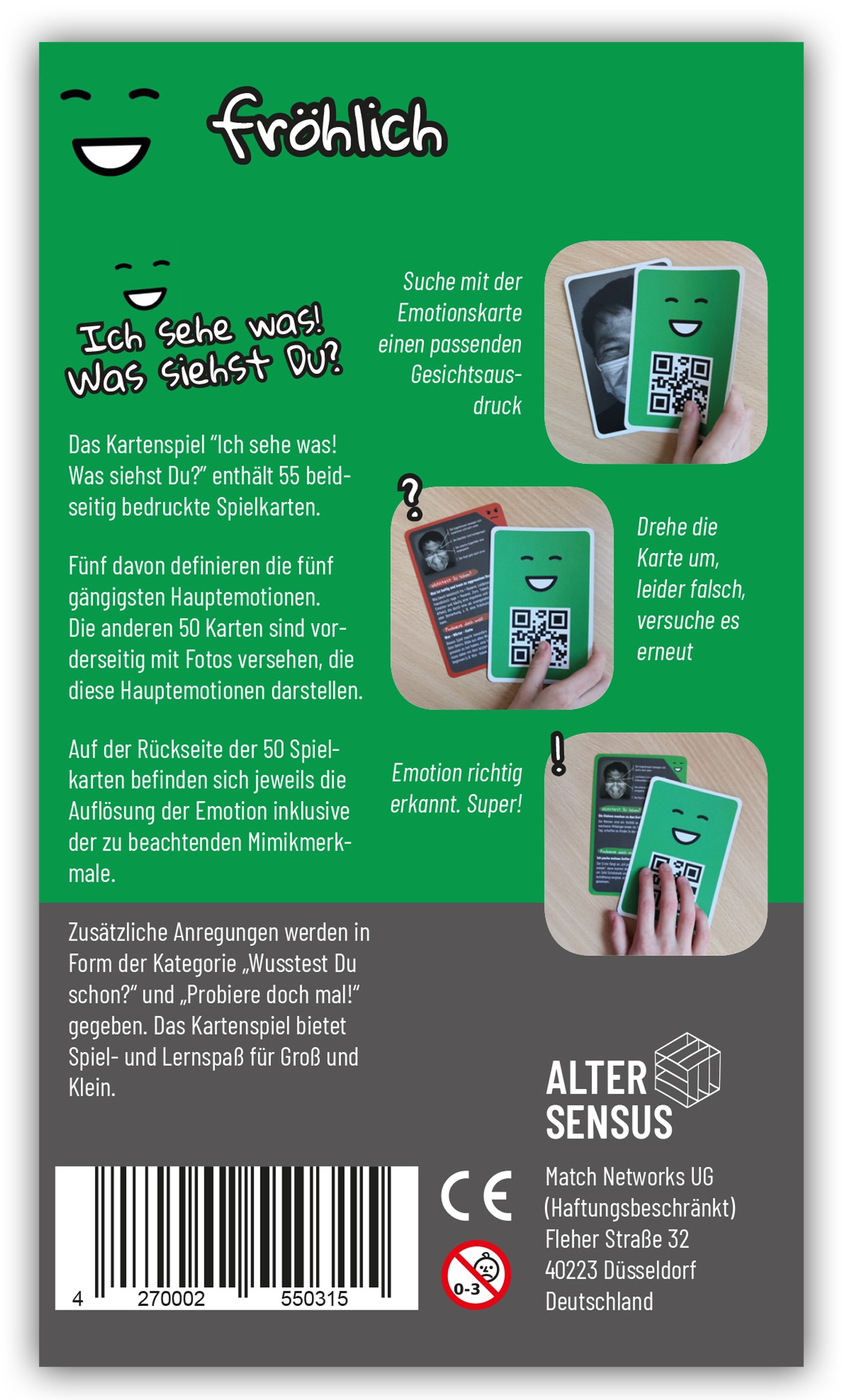 Lenniger, FelixFelix Lenniger ist Musikpädagoge, Multiinstrumentalist (spielt unter anderem Saxophon, Cello, Piano, Bass, Drums) & Musikproduzent. Er hat unter anderem Musik für BMG, Netflix und BBC produziert. Mit seinem Verein KarmaGrooves e.V. engagiert er sich zudem für Bildungsprojekte in Indien. Gemeinsam mit weiteren Kollegen hat er "Alter Sensus®" gegründet und sie entwickeln pädagogisch/therapeutische Spiele. "Ich sehe was! Was siehst Du? - Emotionen spielend entdecken" ist ihr erstes Werk und richtet sich an alle die Menschen, die lernen wollen die Gefühle hinter der Maske zu lesen und darüber hinaus mehr über Gefühle im Allgemeinen zu erfahren. Mehr Informationen zu den Entwicklern und Projekten: www.alter-sensus.de - www.perspektive-inklusion.de - www.matchnetworks.de Schüppen, TobiasTobias Schüppen ist staatl. anerkannter Erzieher, Dipl. Sozialarbeiter, Marte Meo Therapeut & Supervisor, Gewaltmanger sowie Autismustherapeut. Er engagiert sich unter anderem im Projekt "Perspektive Inklusion", um behinderten Menschen ein Netzwerk und Unterstützung zu bieten, ihr Talent zu fördern. Dabei erschienen z.B. die Bücher "Sprichwörter & Redewendungen" (Teil 1-4). Gemeinsam mit weiteren Kollegen hat er "Alter Sensus®" gegründet und sie entwickeln pädagogisch/therapeutische Spiele. "Ich sehe was! Was siehst Du? - Emotionen spielend entdecken" ist ihr erstes Werk und richtet sich an alle die Menschen, die lernen wollen die Gefühle hinter der Maske zu lesen und darüber hinaus mehr über Gefühle im Allgemeinen zu erfahren. Mehr Informationen zu den Entwicklern und Projekten: www.alter-sensus.de - www.perspektive-inklusion.de - www.matchnetworks.de