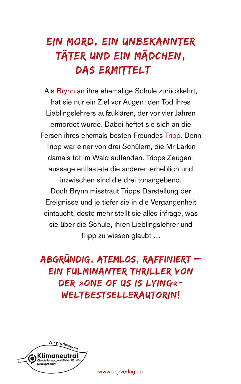 Als Brynn an ihre alte Schule zurückkehrt, hat sie nur ein Ziel vor Augen: den Tod ihres Lieblingslehrers aufzuklären, der vor vier Jahren ermordet wurde. Ausgerechnet Brynns ehemals bester Freund Tripp war einer der drei Schüler, die Mr Larkin tot auffanden. Seine Zeugenaussage entlastete seine Mitschüler erheblich. Doch Tripp hat nie vergessen, was er für die beiden getan hat - und dass alles eine Lüge war. Als Brynn ermittelt, stellt sie nach und nach alles infrage, was sie über die Schule, ihren Lieblingslehrer und ihren besten Freund zu wissen glaubt...Rasant, sexy, umwerfend: der neue raffinierte Thriller von der Weltbestsellerautorin von »One of us is lying«! Mit meisterhaft geplotteten Wendungen und einnehmenden, komplexen Figuren garantieren McManus' Bücher eine Suchtgefahr, der man sich nicht entziehen kann.Weitere Romane von Karen M. McManus bei cbj & cbt:One Of Us Is LyingTwo Can Keep A SecretOne Of Us Is NextThe CousinsYou will be the death of meNothing more to tellOne of us is backAlle Bücher können unabhängig voneinander gelesen werden.