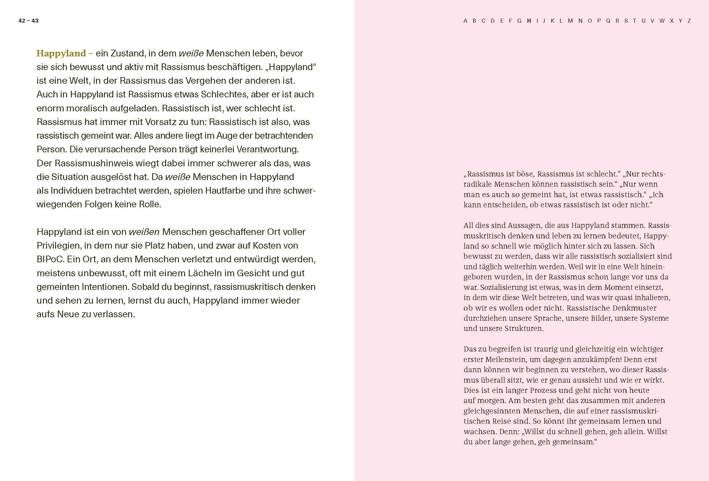 Tupoka Ogette ist DIE deutsche Vermittlerin für Rassismuskritik - auf ihren vielen Plattformen erklärt sie ihrem Publikum täglich, was Rassismus bedeutet und wie wir ihm entgegentreten können. In »Ein rassismuskritisches Alphabet« ordnet sie jedem Buchstaben von A-Z einen Begriff rund um das Thema Rassismus zu, definiert und ordnet ihn anschließend ein. Anhand von Fragen der Autorin können die Leser*innen auf einer freien Seite das Thema vertiefen. Das vierfarbige »Nachschlagewerk« und Workbook basiert auf Tupoka Ogettes Alphabet auf ihrem Instagramkanal und erscheint erstmals überhaupt in Buchform.Das Nachschlagewerk der SPIEGEL- Bestsellerautorin von »exit RACISM - Rassismuskritisch denken lernen« hinterfragt Denkgewohnheiten, deutet auf Alltagsrassismus hin und zeigt Möglichkeiten auf, wie wir rassismuskritisch denken und leben können.