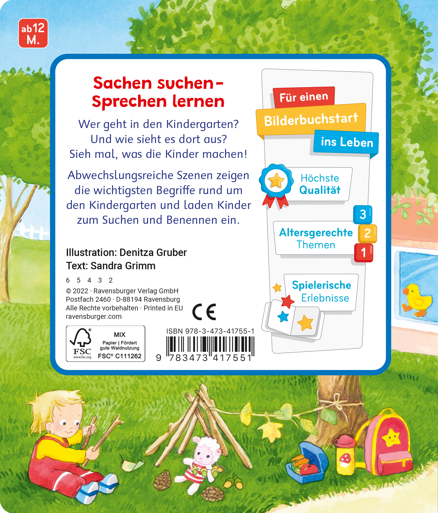 Die Pappbilderbücher aus der Kleinkindreihe "Mein erstes Sachen Suchen" im extra handlichen Format sind der ideale Einstieg in die beliebte "Sachen suchen"-Welt. Auf jeder Doppelseite können die Kleinen ab 12 Monaten Vignetten benennen und in bekannten Situationen im Bild wiedererkennen. So wird der Spracherwerb optimal unterstützt. Die Seiten sind extra dick und damit stabil und langlebig. So können schon kleine Kinderhände diese leicht umblättern, um auf jeder Seite etwas Neues zu entdecken. In diesem Buch dreht sich alles um den Kindergarten und die Kita. Wie es dort aussieht und was die Kinder zusammen machen, das alles wird in sieben Szenen gezeigt. Zusammen wird gespielt, gegessen, geschlafen, und auch mal um ein Spielzeug gestritten. Die plakativen Suchbilder laden zum genauen Hinsehen ein. Beim gemeinsamen Benennen und Wiederfinden wird der Wortschatz erweitert.