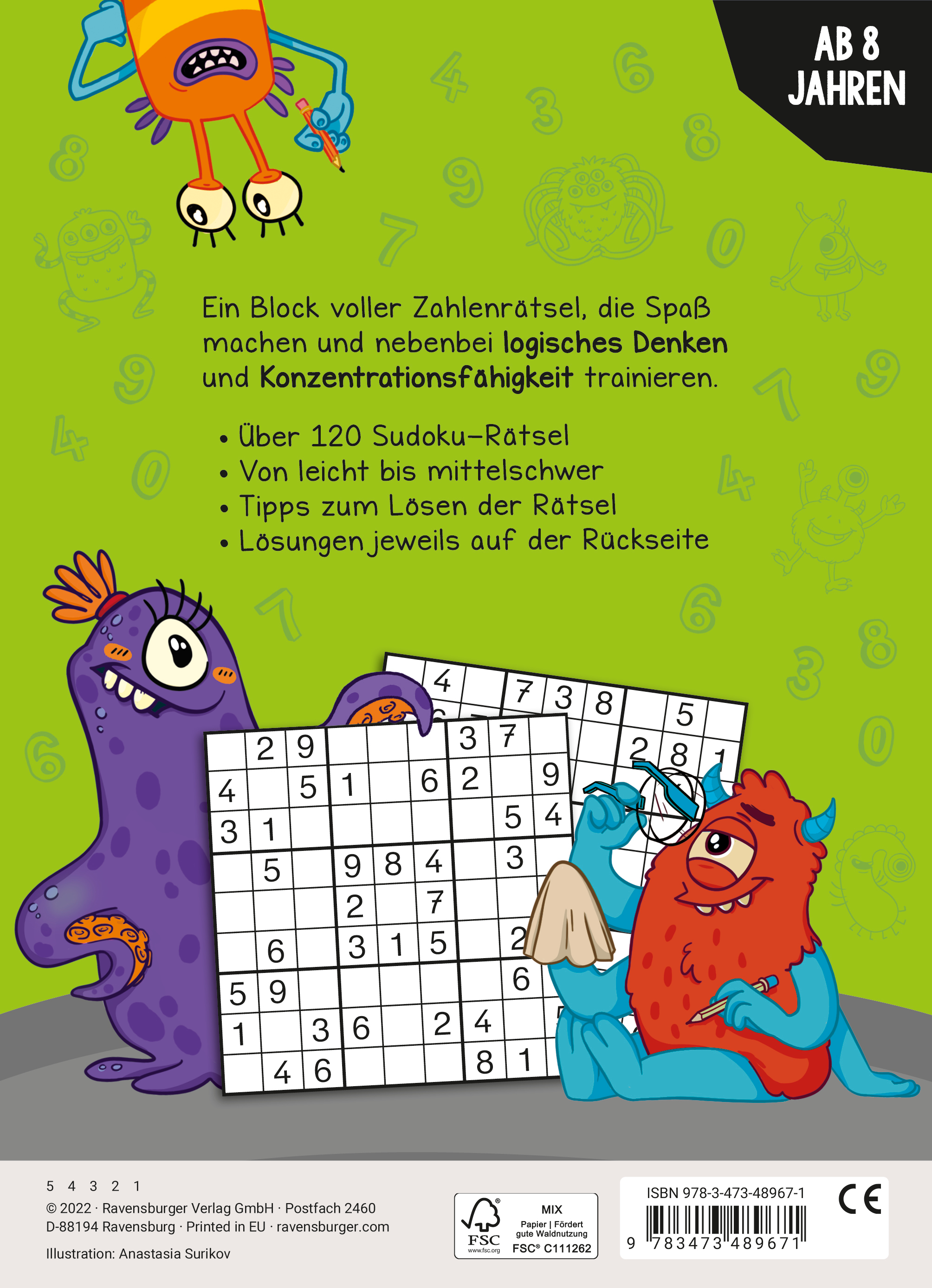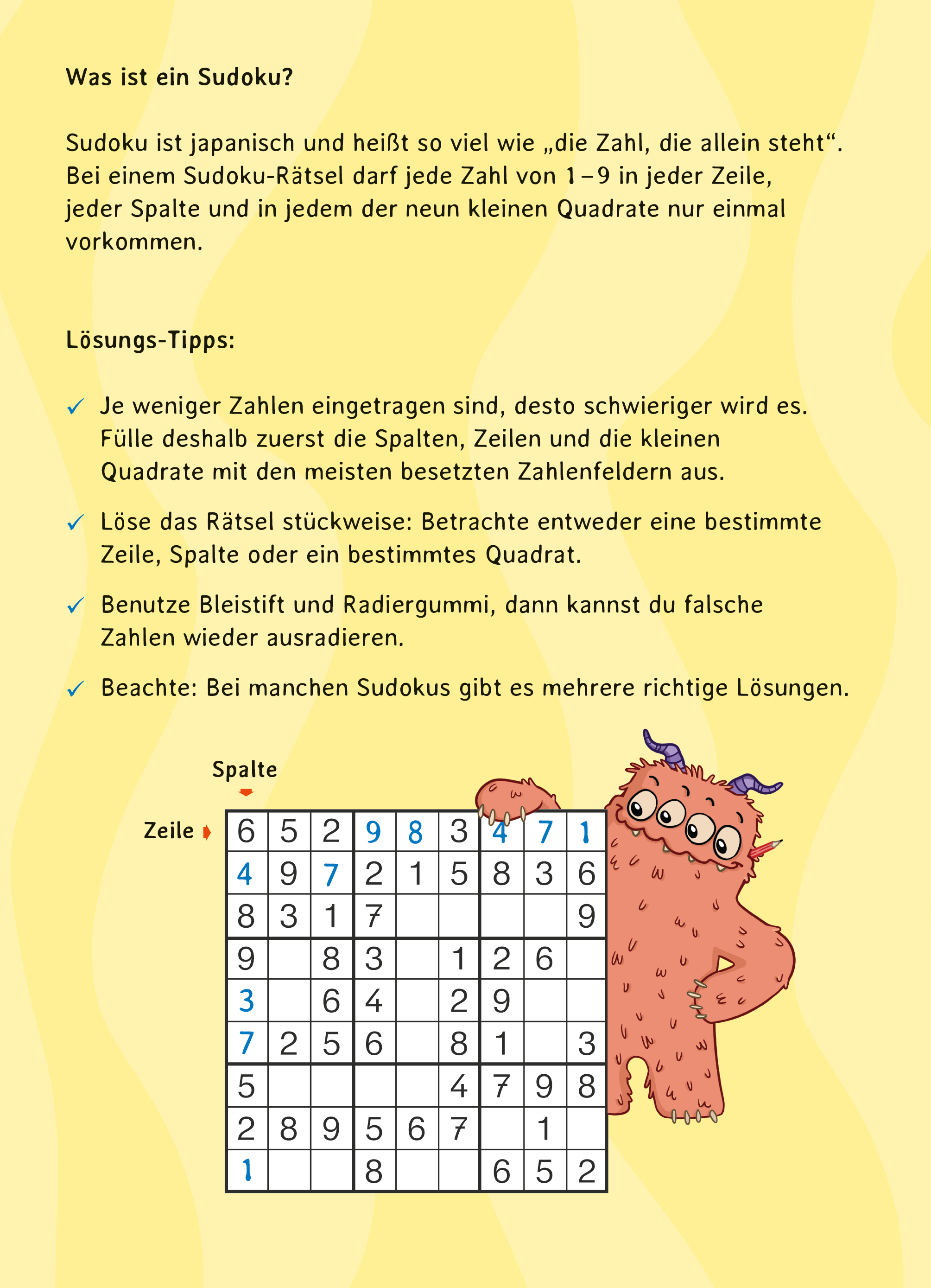 Dieser Block enthält über 150 Sudoku-Rätsel in unterschiedlichen Schwierigkeitsstufen und zahlreiche Tipps zum Lösen der Rätsel. Ganz nebenbei werden hier logisches Denken und Konzentrationsfähigkeit trainiert. Begleitet von lustigen Monstern bleiben hier bei Sudoku-Fans keine Wünsche offen.