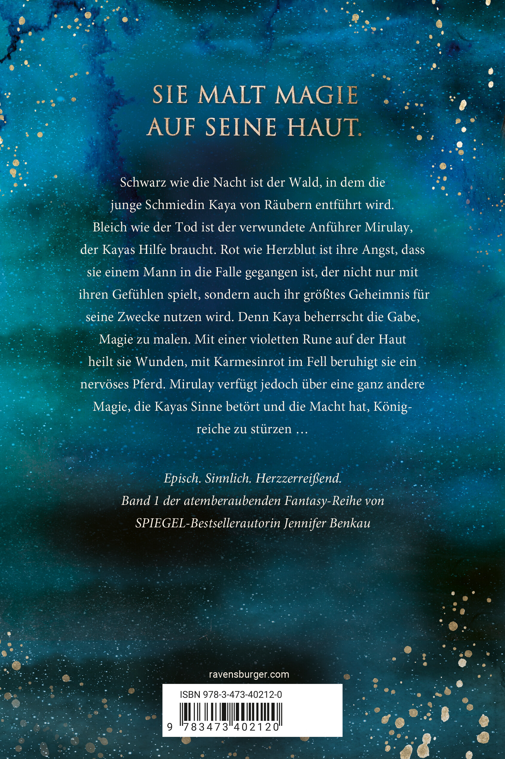 Nachtschwarz ist der Wald, in dem die junge Schmiedin Kaya von Räubern entführt wird. Totenbleich ist der verwundete Anführer Mirulay, der Kayas Hilfe braucht. Blutrot ist ihre Angst, dass sie einem Mann in die Falle gegangen ist, der nicht nur mit ihren Gefühlen spielt, sondern auch ihr größtes Geheimnis für seine Zwecke nutzen wird. Denn Kaya beherrscht die Gabe, Magie zu malen. Mirulay verfügt jedoch über eine ganz andere Magie, die Kayas Sinne betört und die Macht hat, Königreiche zu stürzen