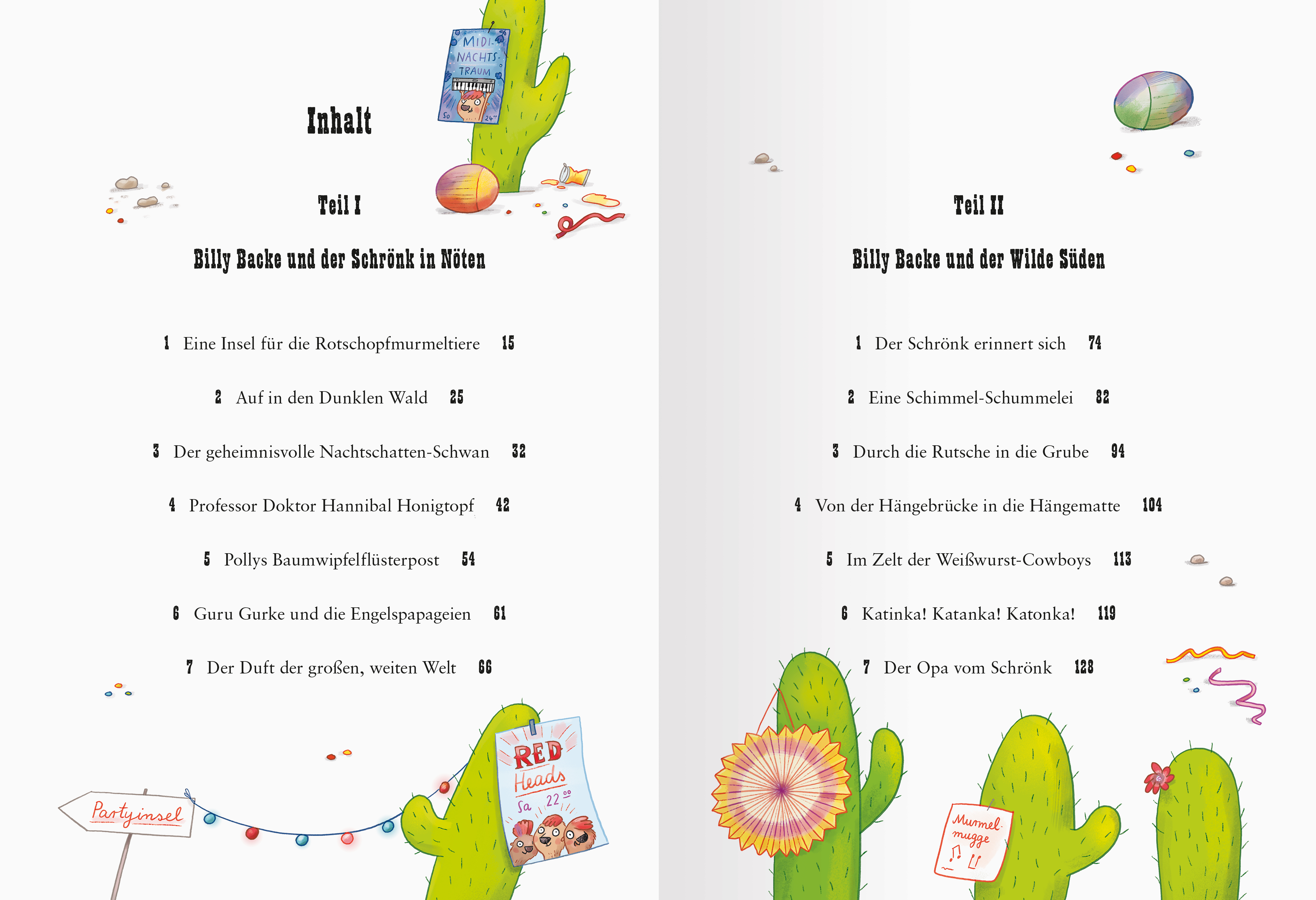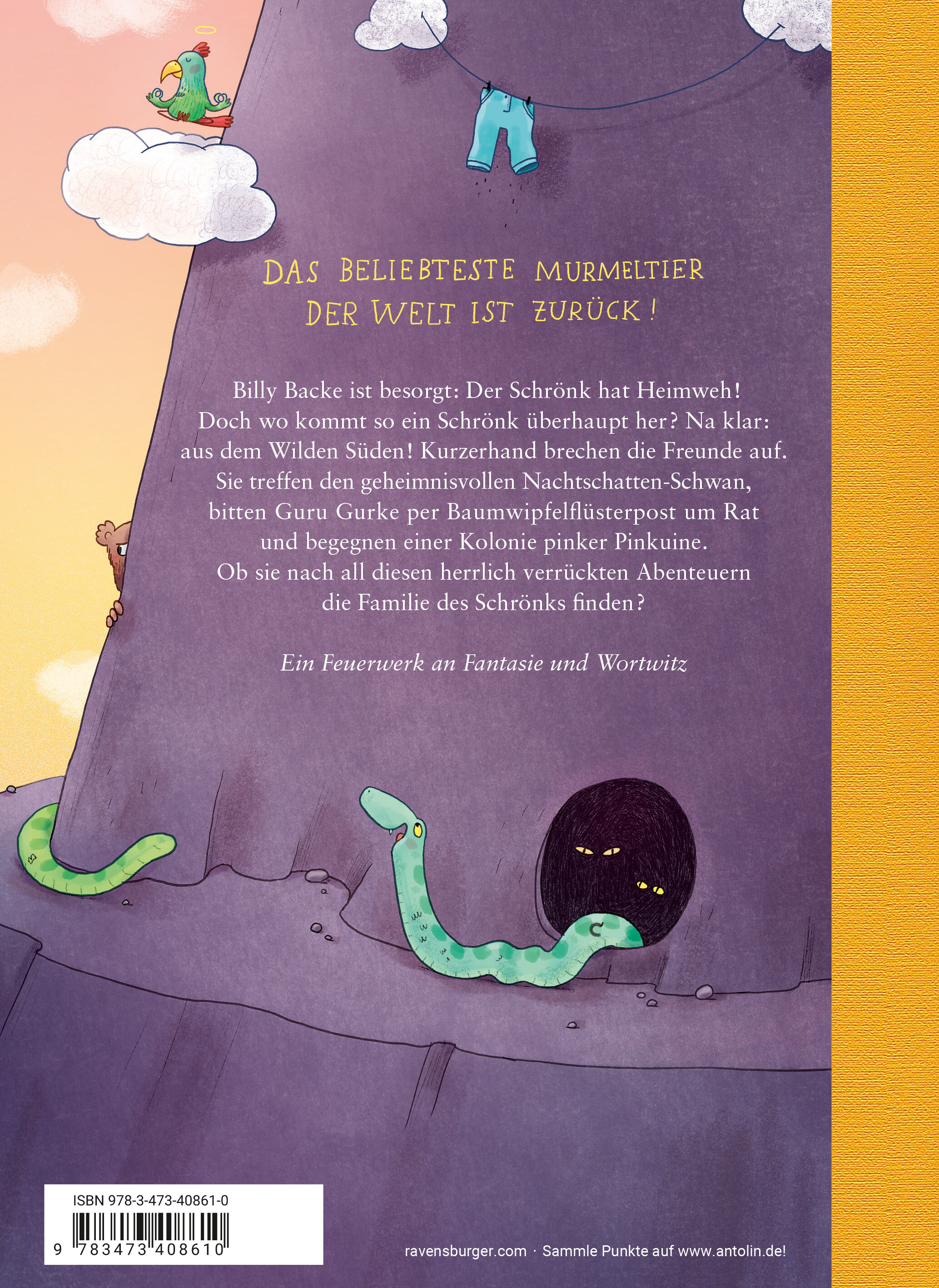 Billy Backe ist besorgt: Der Schrönk hat Heimweh! Doch wo kommt so ein Schrönk überhaupt her? Na klar: aus dem Wilden Süden! Kurzerhand brechen die Freunde auf. Sie treffen den geheimnisvollen Nachtschatten-Schwan, bitten Guru Gurke per Baumwipfelflüsterpost um Rat und begegnen einer Kolonie pinker Pinkuine. Ob sie nach all diesen herrlich verrückten Abenteuern die Familie des Schrönk finden?