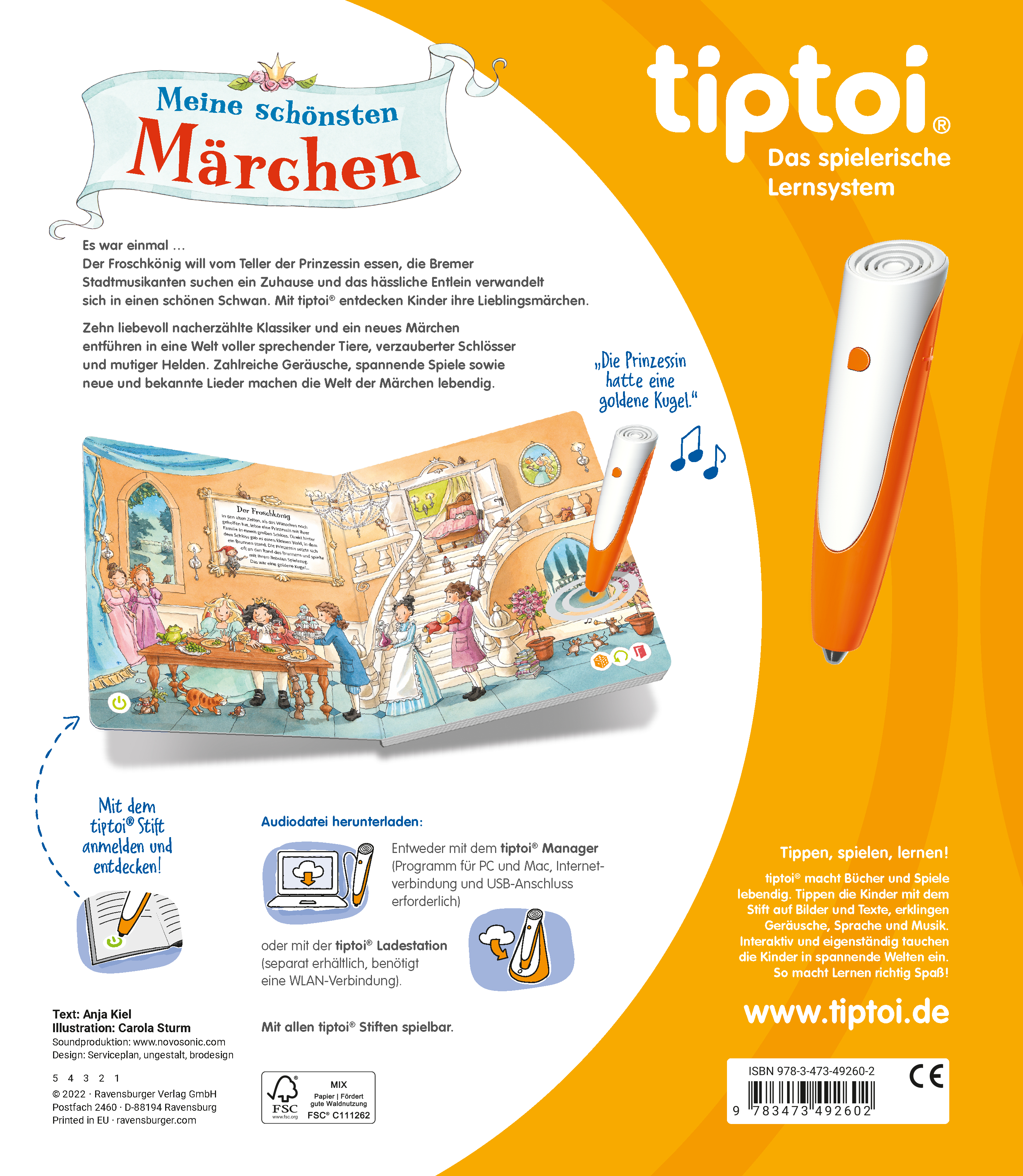 Der Froschkönig will vom goldenen Teller der Prinzessin essen, die Bremer Stadtmusikanten suchen ein neues Zuhause und das hässliche Entlein verwandelt sich in einen wunderschönen Schwan - mit tiptoi entdecken Kinder interaktiv ihre Lieblingsmärchen. Die verzauberte Märchenwelt wird durch zahlreiche Geräusche und witzige Dialoge lebendig. So erzählen die Helden der Geschichte, warum es wichtig ist, Versprechen zu halten oder warum eine echte Prinzessin auf der Erbse nicht einschlafen kann.