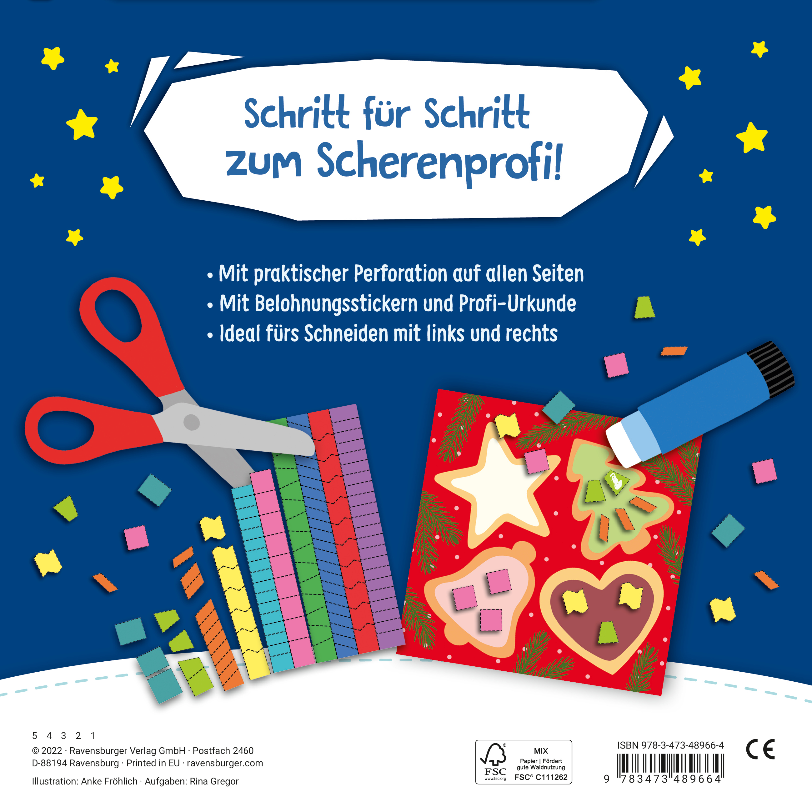 Schnipsel und Streifen schneiden, Einschneiden, Formen und Figuren ausschneiden - von Lektion zu Lektion trainieren die Kinder grundlegende Schneide-Fertigkeiten. Durch das Einkleben des Schnittmaterials auf die passend illustrierten Seiten haben sie ihren Fortschritt immer vor Augen. Und haben die Kinder eine Lektion beendet, werden sie mit einem tollen Sticker belohnt. So bleiben sie langfristig am Ball. Infos zu den Übungen und Tipps zum Umgang mit Schere und Kleber bieten den begleitenden Erwachsenen Hilfestellung. Die lustigen Aufgaben machen nicht nur Spaß, es entstehen auch noch tolle Bilder. Diese können ganz leicht an der Perforation herausgetrennt und verschenkt werden. Und wurden alle Lektionen gemeistert, können die kleinen Scheren-Profis stolz ihre Profi-Urkunde präsentieren.