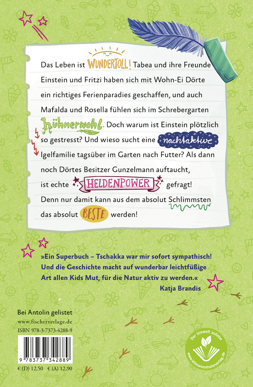 Das Leben ist wundertoll! Tabea und ihre Freunde Einstein und Fritzi haben sich mit Wohn-Ei Dörte ein richtiges Ferienparadies geschaffen, und auch Mafalda und Rosella fühlen sich im Schrebergarten hühnerwohl. Doch warum ist Einstein plötzlich so gestresst? Und wieso sucht eine nachtaktive Igelfamilie tagsüber im Garten nach Futter? Als dann noch Dörtes Besitzer Gunzelmann auftaucht, ist echte Heldenpower gefragt! Denn mit der kann aus dem absolut Schlimmsten das absolut Beste werden!