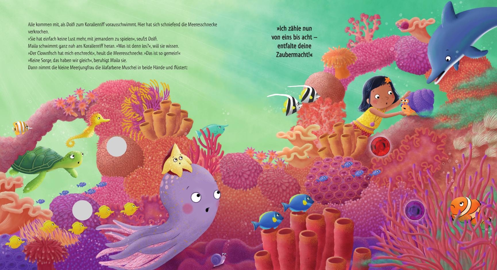 Zusammen mit ihrem Delfinfreund Dolfi macht sie sich mit vier magischen Muscheln auf den Weg. Ob es ihr gelingt, mit ihnen den Schlechte-Laune-Zauber zu brechen?