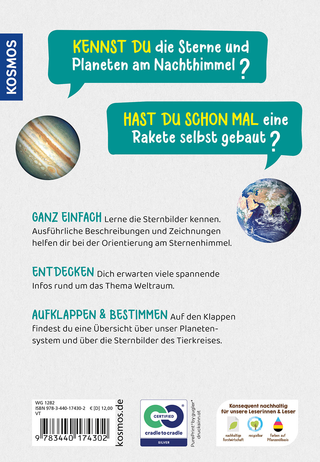 Kompetent und kindgerecht stellt dieser Kindernaturführer die spannende Welt der Sterne vor. Spielerisch lernen Kinder die 35 wichtigsten Sternbilder schnell und sicher am Himmel zu entdecken. Die jungen Forscher bekommen viele Mitmach-Ideen und können sich über aktuelle Raumfahrthemen wie SpaceX informieren. KOSMOS - konsequent nachhaltig. Produziert nach dem zertifizierten Cradle-to-Cradle-Prinzip.