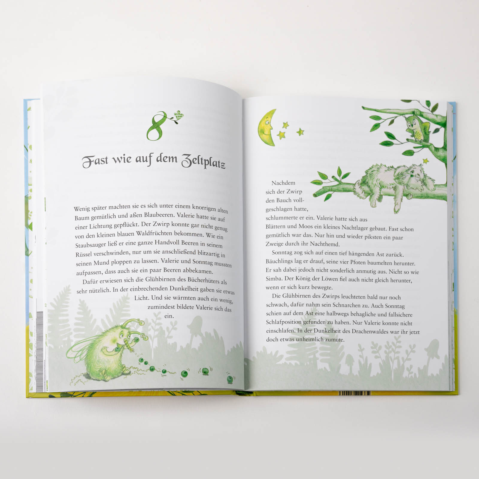 Abgesehen von ihrem Hund Sonntag liebt Valerie nichts so sehr wie die Geschichten in ihren Lieblingsbüchern. Deshalb ist sie begeistert, als ihre Lehrerin zu einer Lesenacht in der Schule einlädt. Doch in der Schulbibliothek trifft sie bei Mondschein auf ein unglaubliches Wesen: den Bücherzwirp. Der grüne, fellige Zwirp sorgt dafür, dass alle Buchfiguren schön in ihren Geschichten bleiben. Leider ist er nicht besonders geschickt und gerade sind ihm zwei Märchenfiguren entwischt. Valerie zögert nicht lange: Zusammen mit Sonntag springt sie dem Zwirp in ein Buch hinterher und steckt mitten in einem fantastischen Abenteuer.