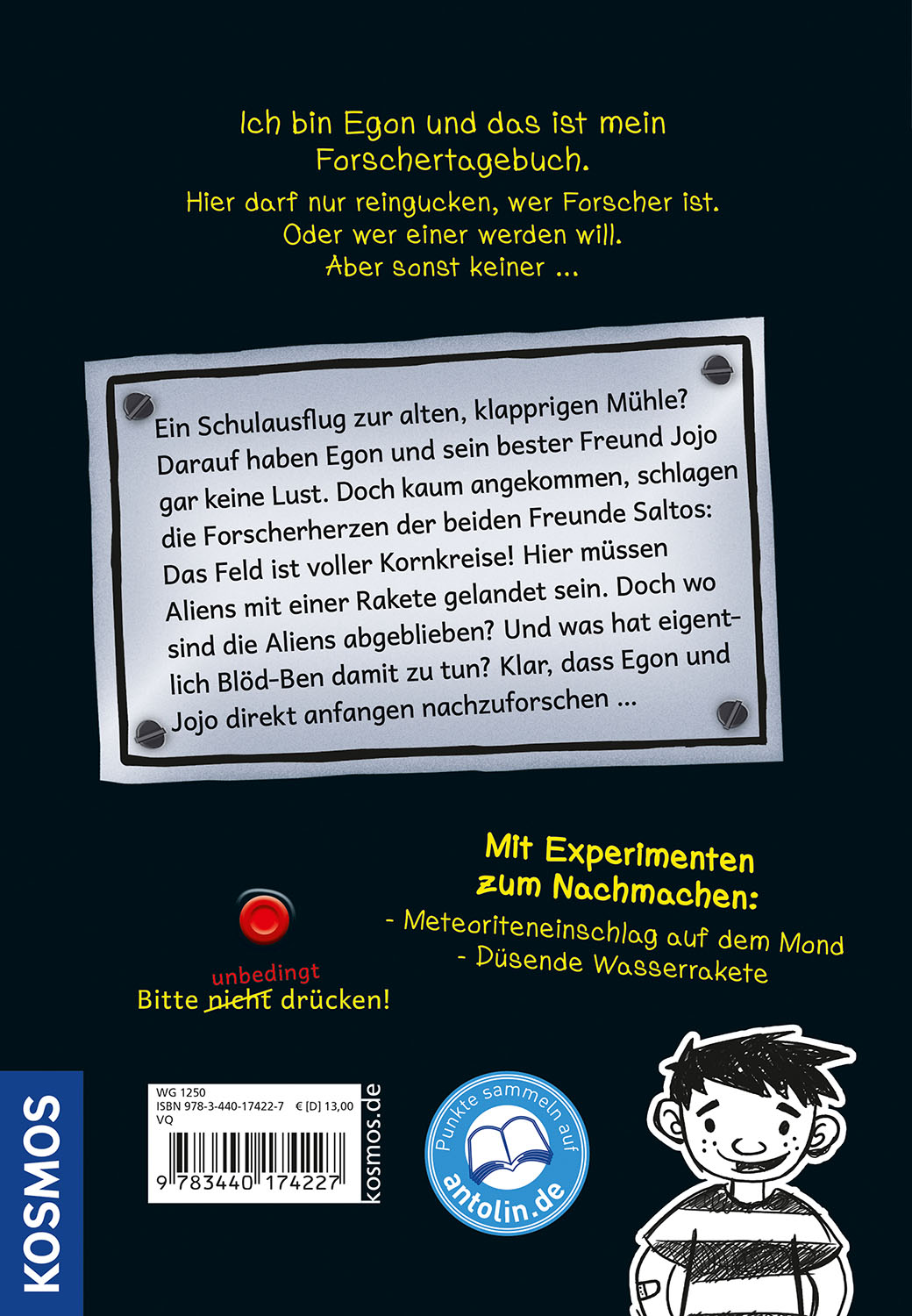 Ich bin Egon und das ist mein Forscher-Tagebuch. Hier darf nur reingucken, wer Forscher ist. Oder wer einer werden will. Aber sonst keiner ...Egon und Jojo entdecken auf einer Schul-Exkursion riesige Kornkreise. Wer kann die bloß fabriziert haben? Etwa ein Ufo? Und was passiert, wenn ein Asteroid auf die Erde zurast? Jojo macht das alles ziemlich nervös. Aber Egon tüftelt schon am Plan für eine Asteroiden-und-Alien-Abwehrrakete ... Natürlich stolpern die Freunde beim Experimentieren wieder von einer Katastrophe in die nächste - lustiges Chaos garantiert! Für alle, die selbst gern forschen möchten, gibt es im Buch spannende Weltraum-Experimente zum Nachmachen.