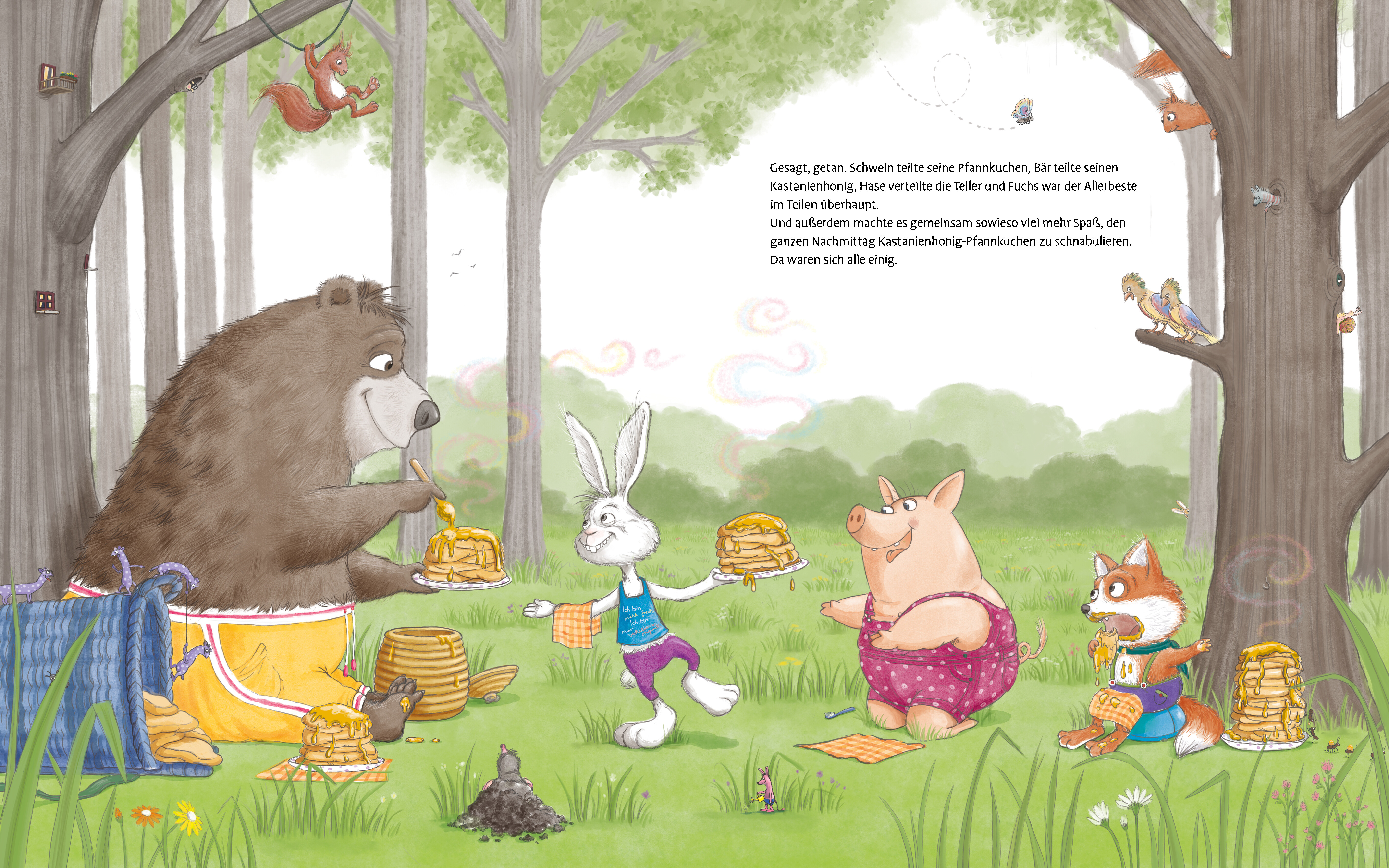 Schwein hat Appetit auf Pfannkuchen und backt einen riesigen Stapel. Doch Pfannkuchen schmecken nur mit Honig richtig gut. Aber woher nehmen und nicht stehlen? Mmh, stehlen? Hat Bär nicht einen Honigvorrat in seiner Höhle? Gesagt, getan.