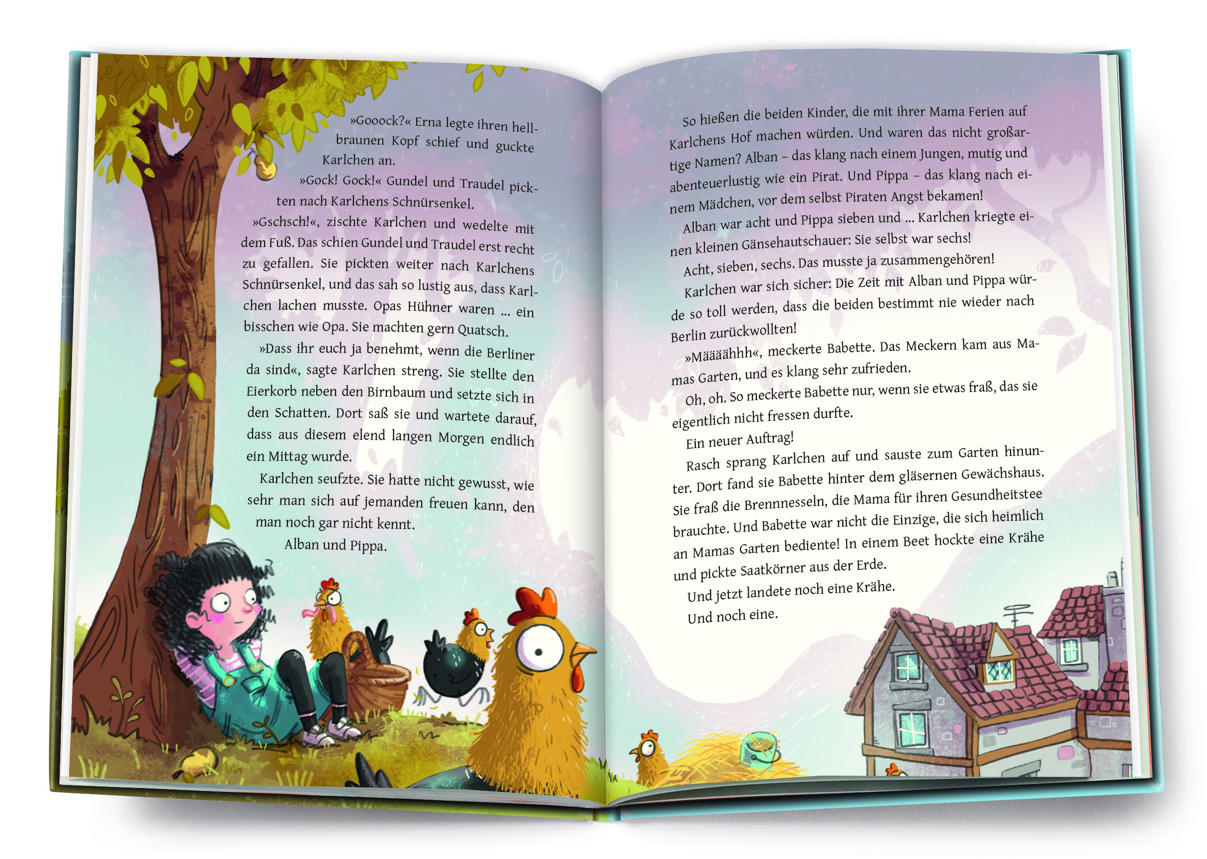 Karlchen ist der hilfsbereiteste Mensch, den man sich vorstellen kann. Doch manche Leute wollen sich einfach nicht von ihr helfen lassen. Wie die beiden Stadtkinder Alban und Pippa, die auf Karlchens Bauernhof Ferien machen. Die haben nämlich Angst vor Tieren. Aber mit einem Eimer voller Stinkkäfer und Umberto, dem freundlichsten Hängebauchschwein der Welt, müsste das doch zu ändern sein! Leider geht Karlchens Hilfsaktion schief. Und Mama hält das Ganze auch noch für einen fiesen Streich, was bedeutet: Karlchen muss im Wäschezimmer Socken sortieren. Dabei hat Karlchen gleich die nächste Idee, wie sie Alban und Pippa helfen kann. Und diesmal klappt es bestimmt!