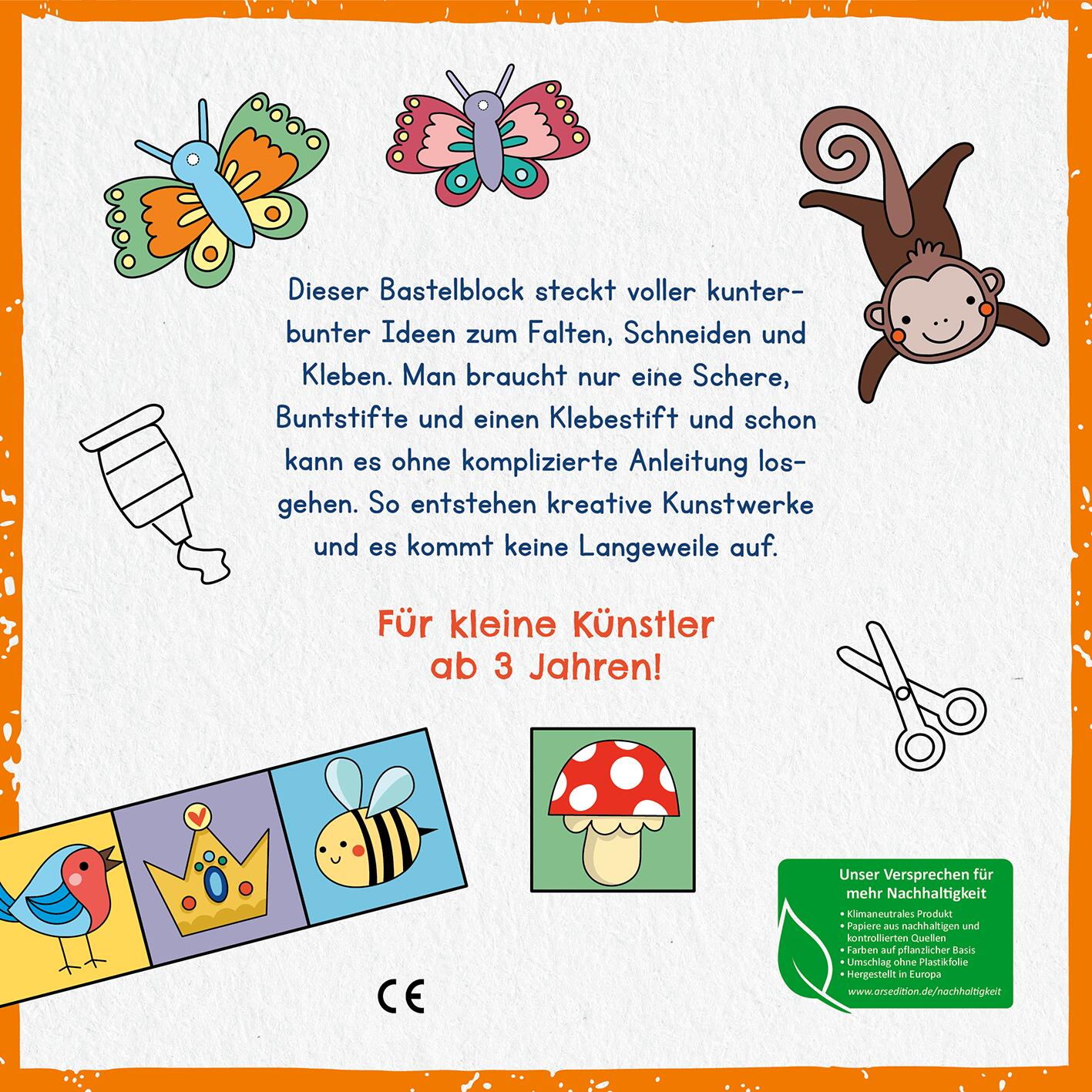 In diesem Bastelblock stecken kunterbunte Ideen zum Falten, Schneiden und Kleben. Man braucht nur eine Schere, Buntstifte und einen Klebestift und schon kann es ohne komplizierte Anleitung losgehen.