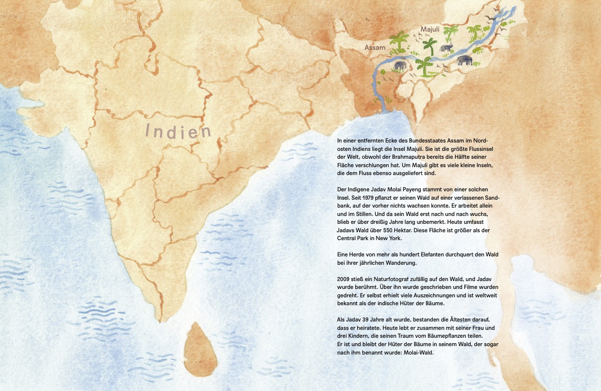 Was kann eine einzelne Person angesichts der weltweiten Umweltzerstörung schon ausrichten? Der Inder Jadav Payeng hat bewiesen, dass jeder Einzelne von uns eine ganze Menge bewirken kann. Als Junge begann er, auf einer Sandbank im Bundesstaat Assam Bäume zu pflanzen. Niemand glaubte, dass er damit Erfolg haben würde. Doch seit 1979 ist so ein Wald von der Fläche des Central Park entstanden, der unzähligen Tieren und Pflanzen eine Heimat bietet. Erst 2007 entdeckte ein Fotograf den Wald zufällig und machte Payeng über Indien hinaus bekannt. Rina Singh hat die Geschichte des Jungen Jadav einfühlsam nacherzählt. Ishita Jain entdeckten wir auf der Illustrators Wall der Kinderbuchmesse in Bologna. Ihr Stil erschien uns für die wuchernde Vegetation in der Geschichte ideal. In ihrem Bilderbuch-Debüt lässt sie uns nun in einen spektakulären Lebensraum eintauchen, dessen Existenz an ein wahr gewordenes Wunder grenzt.