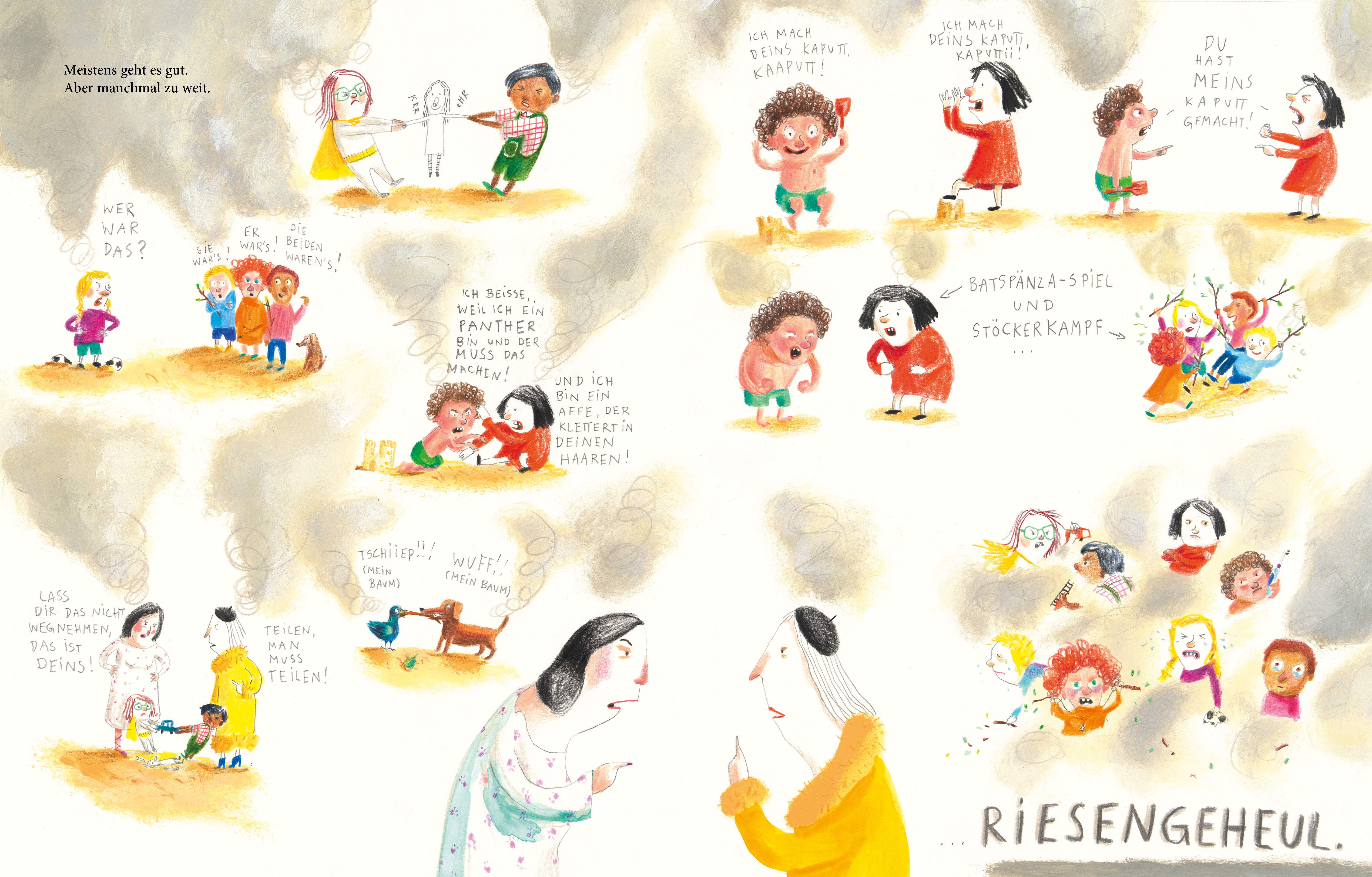 Mit großen, bunten, wuseligen Bildern voller witziger Details lässt die Autorin aus der Perspektive von Kindern die Thematik des unvorsichtigen oder absichtlichen Kaputtmachens lebendig werden [...] und die Kinder kommen zum Schluss ganz allein darauf, wie man alles wieder gut (und weiter) machen kann.