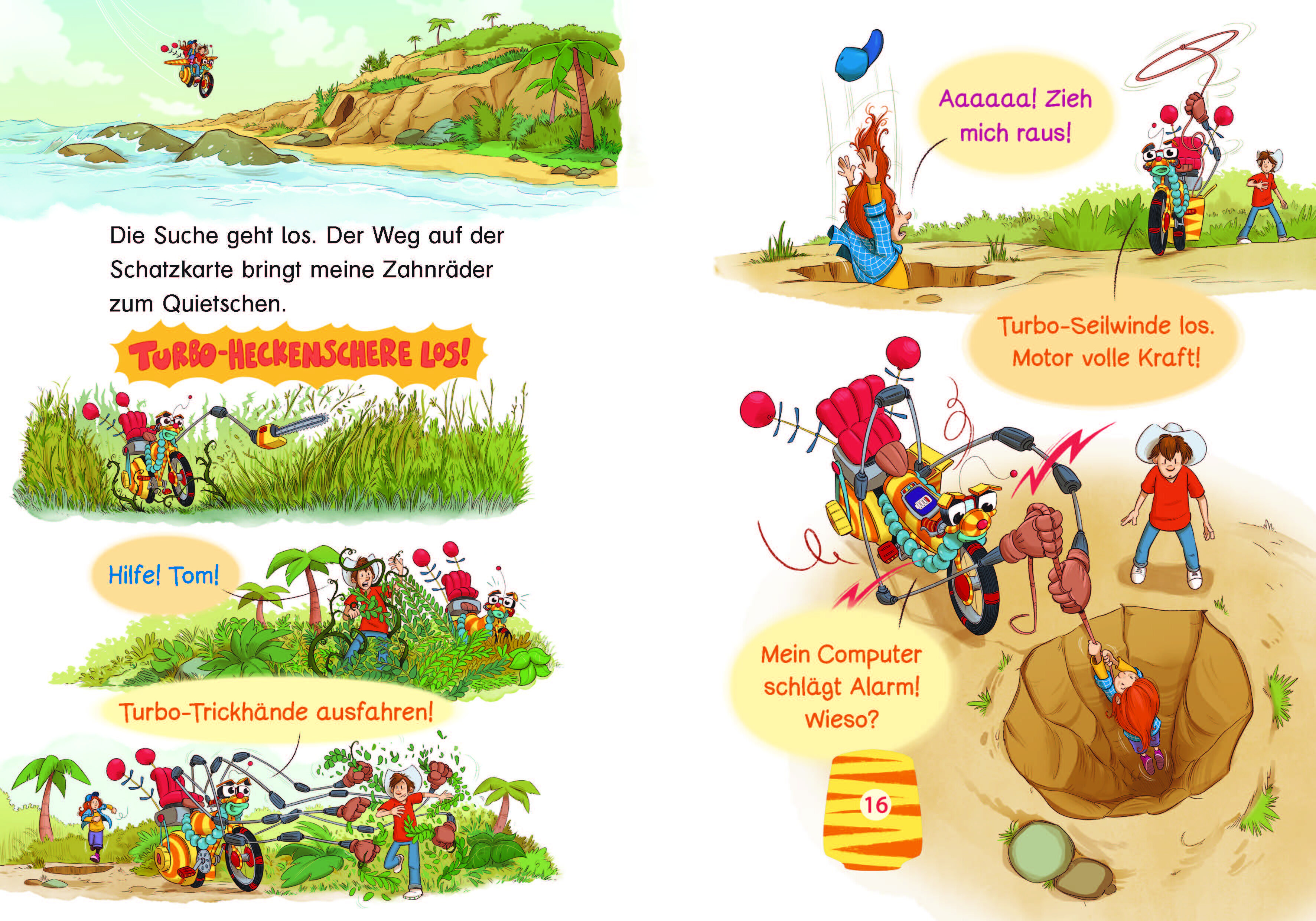 Endlich Ferien! Tom Turbo, Karo und Klaro sind mit den Eltern Klicker ans Meer gereist. Und genau hier wartet der nächste spannende Fall auf sie: Was hat es mit der Pizza auf sich, die aussieht wie eine Schatzkarte? Gauner Beppo Bandini ist bereits hinter dem sagenhaften Schatz her. Können Tom Turbo und seine Freunde ihm zuvorkommen?