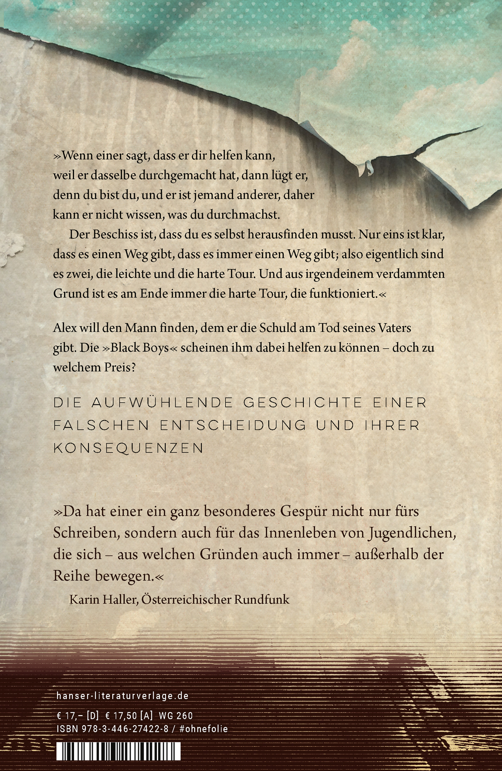 Alex ist wütend. Seit dem Autounfall, bei dem sein Vater ums Leben gekommen ist, ist nichts mehr wie früher. Schuld an allem ist der Fahrer des anderen Wagens, das steht für Alex fest. Er setzt es sich zum Ziel, den Mann zu finden und zu bestrafen. Unterstützung erhofft er sich von den "Black Boys". Dass die rechtsradikale Ansichten vertreten, nimmt er in Kauf. Im Gegenzug muss er sich an den gewalttätigen Aktionen der Gruppe beteiligen. Zusehends verliert Alex die Kontrolle über die Situation und erkennt: Den wahren Rückhalt findet er zu Hause, wo seine Mutter und Tante immer für ihn da sind - ganz gleich, was passiert. Ein eindrücklicher Roman über falsche Entscheidungen, ihre Konsequenzen und die Hoffnung auf einen Neuanfang.