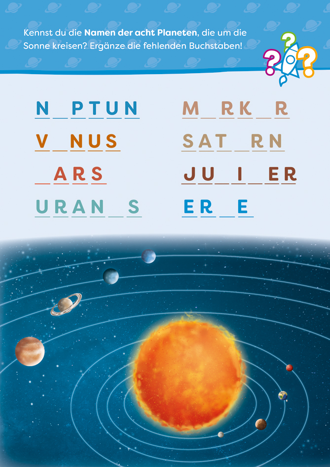 | Schlagworte | ab 7 Jahren • Abenteuer • ab sieben Jahren • Astronaut • Beschäftigung • Beschäftigungsblock • Buchstabensalat • Erde • Fehler • Ferien • finden • Jupiter • Konzentration • Kreuzworträtsel • Labyrinthe • Labyrintherätsel • Langeweile • Logik • Malen • Mars • Meteorid • Meteorit • Mond • Paare finden • Planeten • Punkterätsel • Quiz • Rätsel • Rätselblock • Rätseln,Knobeln • Raumstation • Roboter • Saturm • Schattenrätsel • Schulkinder • Suchen • Sudoku • Universum • Unterschiede • Urlaub • Venus • Von Punkt zu Punkt • Weltall • Weltraum • Wortgitter |