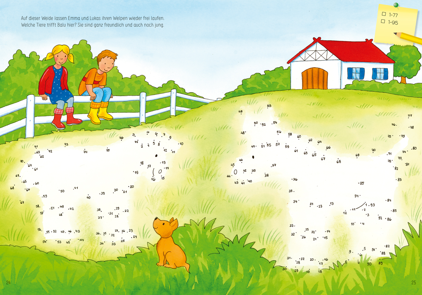 Emma und Lukas machen Ferien auf dem Bauernhof. Auf welche tierischen Hofbewohner die beiden treffen, finden Kinder durch das Verbinden der Punkte von 1 bis 125 und von A bis Z heraus. Ob sich zwischen Kühen, Schafen und Hühnern auch ein passender Freund für den kleinen Familienhund Balu finden lässt? Das tolle Rätselbuch schult ganz nebenbei auch Konzentration und Motorik.