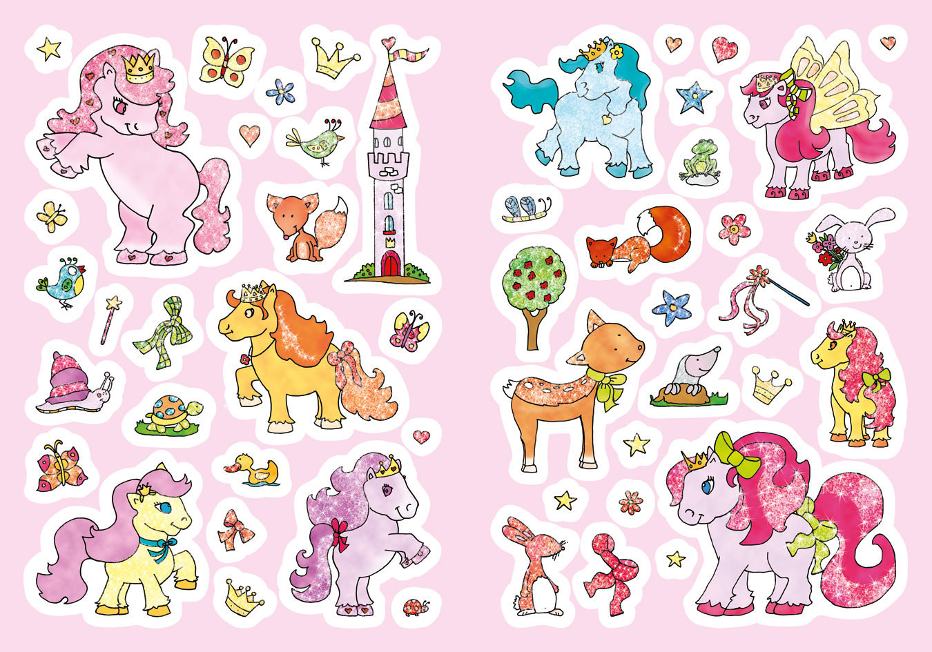 Wunderschöne Zauberponys mit prächtigen Mähnen, auf malerischen Blumenwiesen, in traumhaften Schlossgärten oder vor idyllischen Bergpanoramen laden zum Träumen und Ausmalen ein. Die Glitzer-Sticker aus der Heftmitte verzieren je nach Lust und Laune die großformatigen Szenerien. Glitzernde Zauberponys, Schleifen und Blumen verschönern aber genauso kleine Kunstwerke, Brotdosen oder Freundebücher.