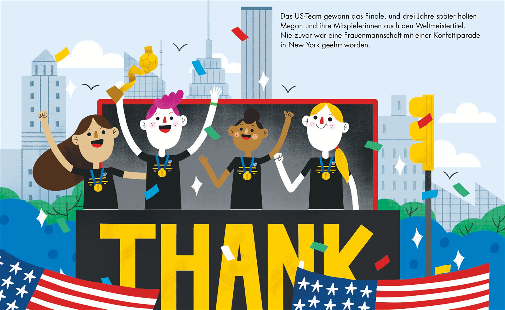 Ein Mädchen muss nicht im hübschen Kleid brav in der Schulbank sitzen, sie kann auch eine Trainingshose anziehen und Fußball spielen, fand Megan Rapinoe, die es schon als 4-Jährige mit den Jungs in der Mannschaft ihres Bruders aufnahm. Ihre Karriere als Profifußballerin ist beispiellos. Zweimal gewinnt sie mit ihrem Team den Weltcup, holt sie Gold bei den Olympischen Spielen, wird sie Sportlerin des Jahres. Megan ist mutig und unkonventionell. Ihr Motto lautet: »Du hast nur ein Leben, geh los und mach was draus.« Und danach lebt sie.