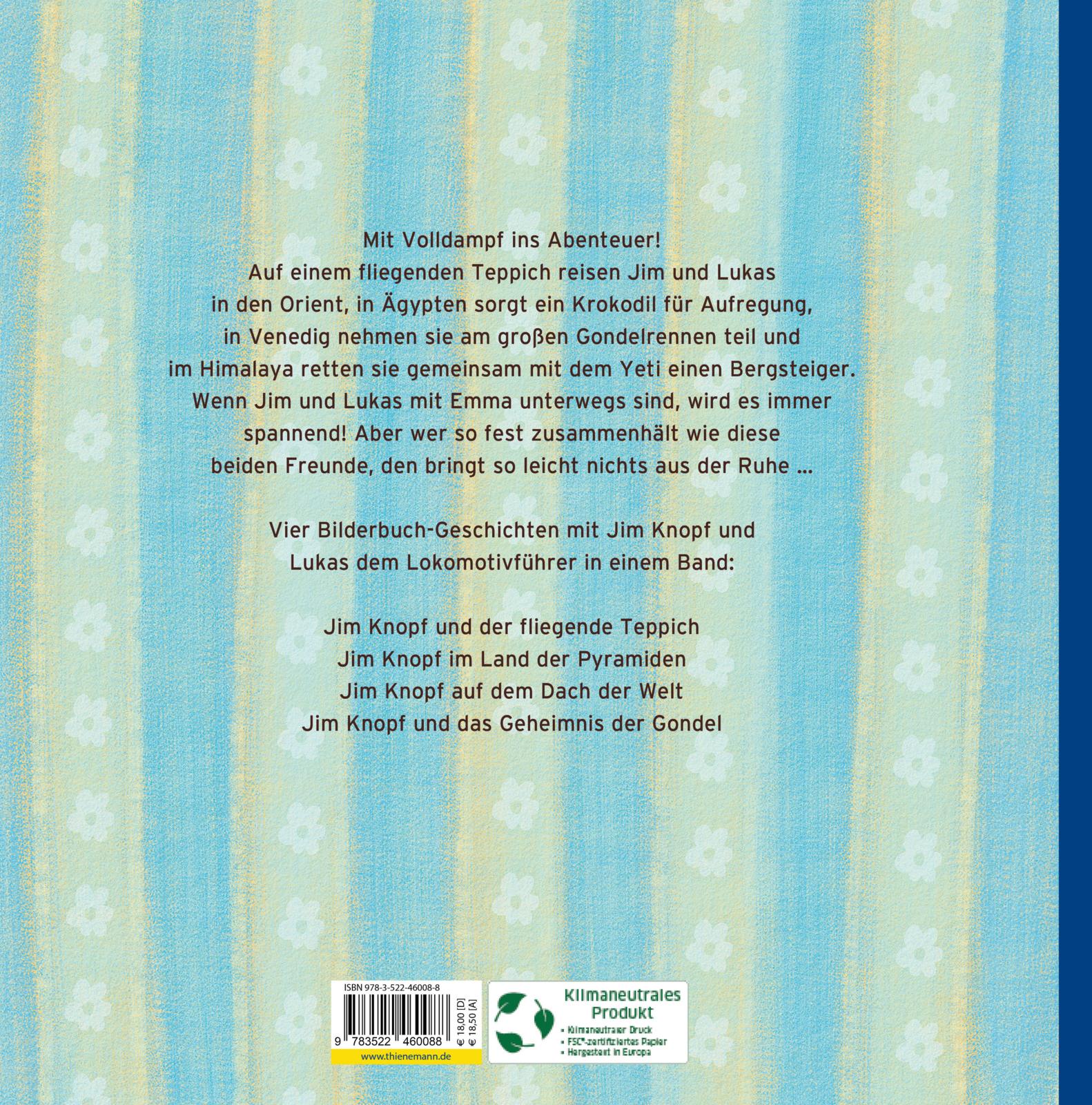 Mit Volldampf um die Welt! Mit einem fliegenden Teppich reisen Jim Knopf und Lukas der Lokomotivführer in den Orient und machen dann beim großen Gondelrennen in Venedig mit. In Ägypten treffen sie ein Krokodil, das für Trubel sorgt. Auch im Himalaya erleben sie ein großes Abenteuer: Gemeinsam mit dem Yeti retten sie einen Bergsteiger. Wenn Jim und Lukas mit Emma unterwegs sind, wird es immer aufregend! Aber wer so fest zusammenhält wie diese beiden Freunde, den bringt so leicht nichts aus der Ruhe ...