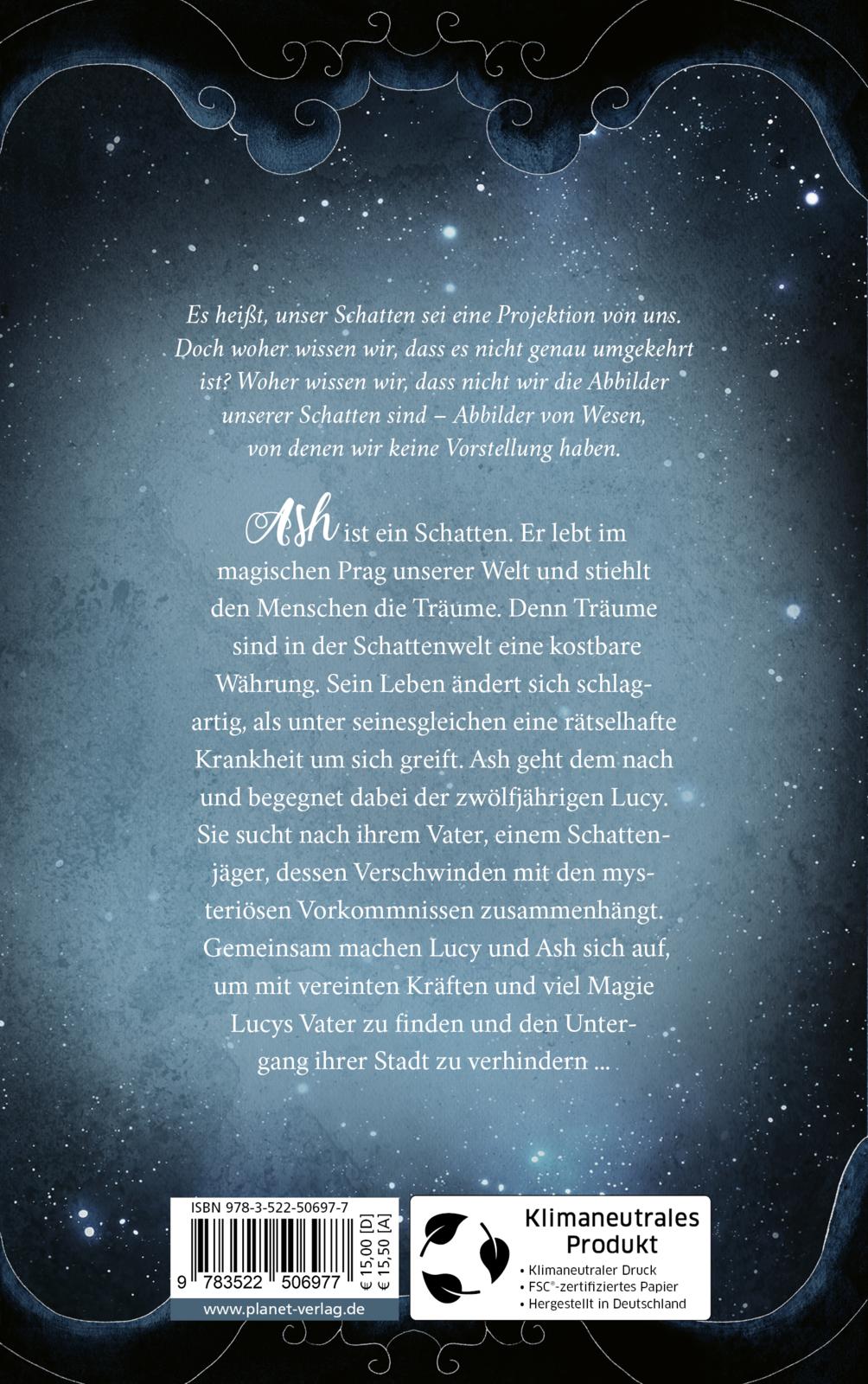 Ash Traumfeuer ist ein Schatten. Er lebt im magischen Prag unserer Welt und stiehlt den Menschen die Träume. Denn Träume sind in der Schattenwelt eine kostbare Währung. Sein Leben ändert sich schlagartig, als unter seinesgleichen eine rätselhafte Krankheit um sich greift. Ash geht dem nach und begegnet dabei der zwölfjährigen Lucy. Sie sucht nach ihrem Vater, einem Schattenjäger, dessen Verschwinden mit den mysteriösen Vorkommnissen zusammenhängt. Gemeinsam machen Lucy und Ash sich auf, um mit vereinten Kräften und viel Magie Lucys Vater zu finden und den Untergang ihrer Stadt zu verhindern ...