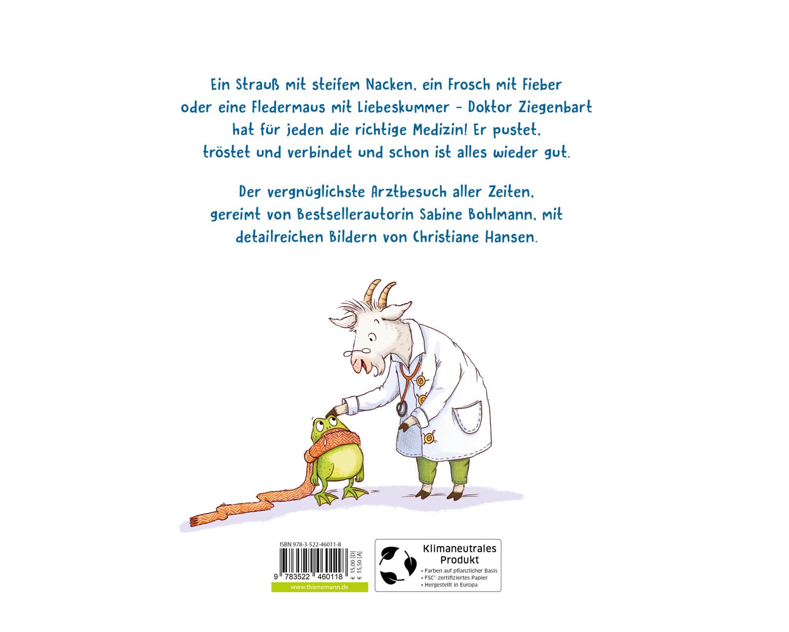 Ein Strauß mit steifem Nacken, ein Frosch mit Husten oder eine Fledermaus mit Liebeskummer - für alle hat Dr. Ziegenbart die richtige Medizin. Bestsellerautorin Sabine Bohlmann reimt sich einmal quer durchs Tierreich und nimmt ganz nebenbei kleinen Kindern die Angst vor dem Arztbesuch. An den detailreichen Illustrationen von Christiane Hansen kann man sich kaum sattsehen.