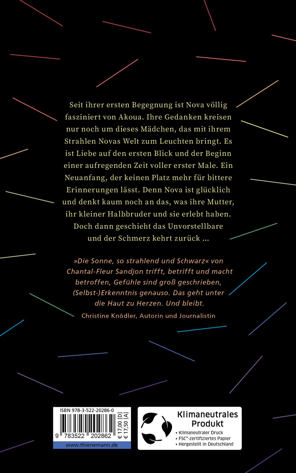 „Sandjon findet einen so warmherzigen Ton, dass die Lektüre von 'Die Sonne, so strahlend und Schwarz' tatsächlich empowernd und wohltuend ist. Das habe selbst ich, ein mittelalter weißer Mann, gespürt. Ich konnte den Roman erst weglegen, nachdem ich ihn in einem Rutsch an einem Abend durchgelesen hatte.“