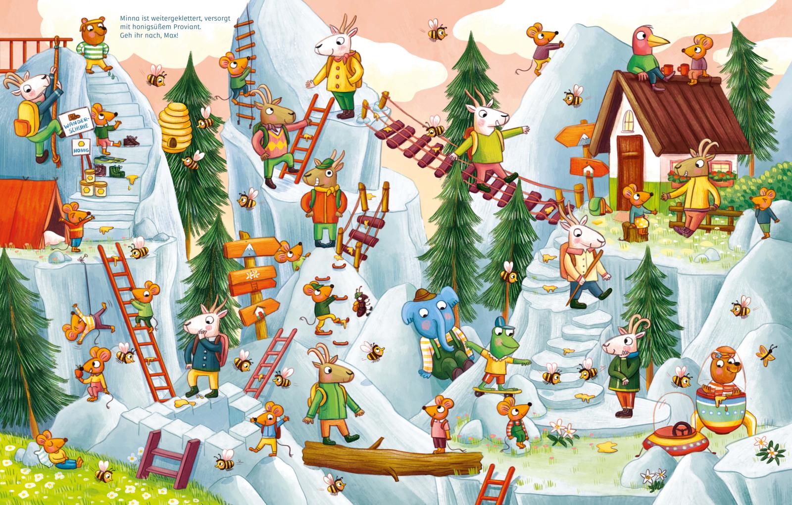 Bärchen Minna folgt dem Schmetterling und Bärchen Max folgt Minna. Eisflecke, Kekskrümel, Farbkleckse, Bananenschalen oder Mondsteine - überall hinterlässt Minna eine Spur und zeigt, welche Wege sie gegangen ist. So geht es Treppe rauf und Treppe runter, Leiter hoch und Stufen bergab, die Bärchen steigen und klettern und rutschen und krabbeln auf immer anderen Wegen durch spannende Welten, vom Baumhaus über das Unterseeboot bis zur Mondstation ist alles dabei.