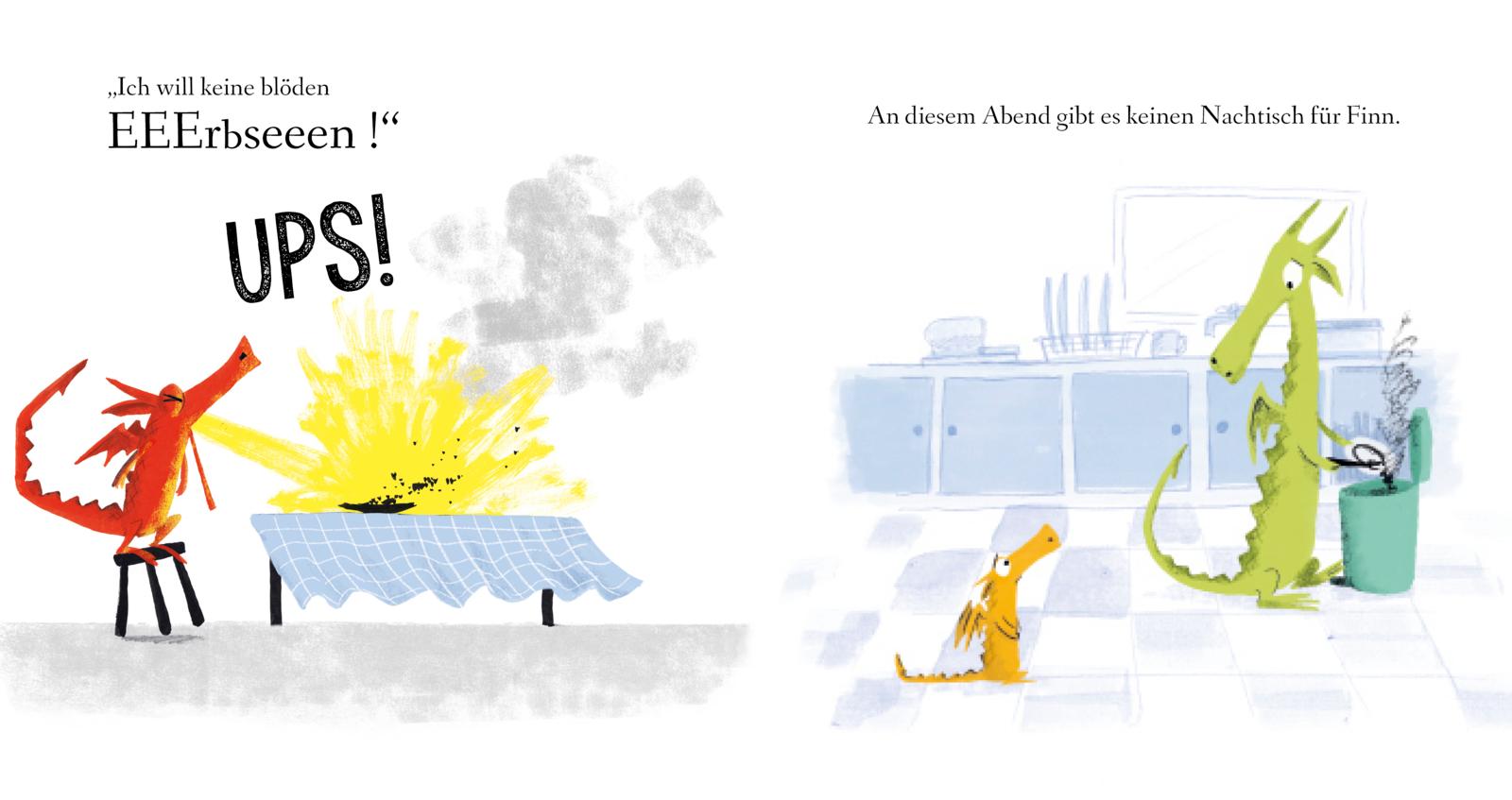 Denn jedes Drachenkind wird mal wütend. Doch wenn Finn wütend wird, spuckt er Feuer! Beim Mittagessen, wenn es blöde Erbsen statt Pudding gibt. Oder beim Fußball, wenn Finn nur im Tor stehen darf. Seine Freunde möchten deshalb nichts mehr mit ihm zu tun haben. Und das macht Finn ganz schön traurig. Zum Glück zeigt Mama Drache ihm einen ganz einfachen Trick, wie man nicht gleich in die Luft geht. So lernen das schon Kinder ab 18 Monaten.