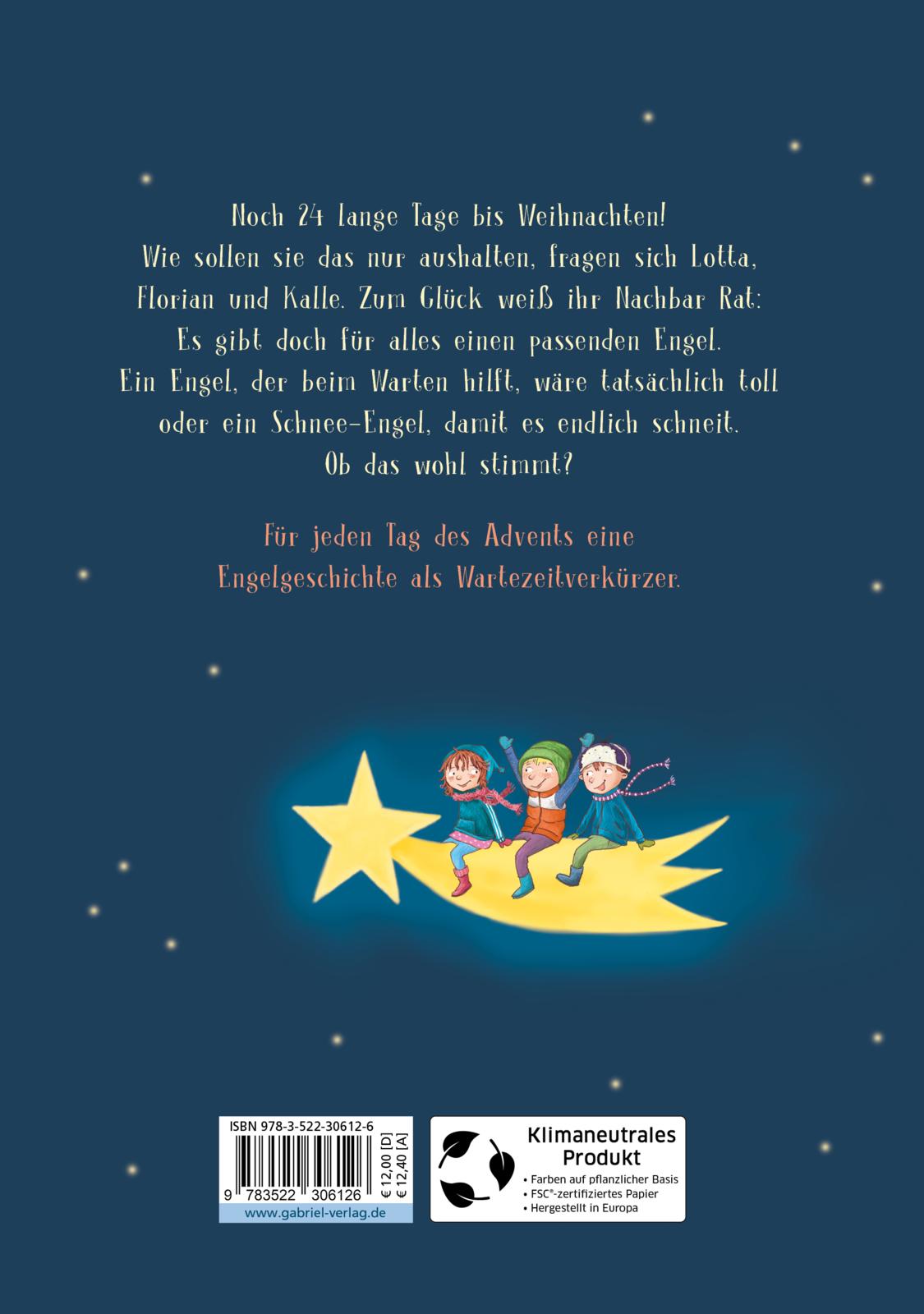 Noch 24 lange Tage Warten! Wie sollen sie das bloß aushalten, fragen sich Lotta, Uwe und Kalle. Zum Glück weiß Herr Brathelling aus dem Nachbarhaus Rat: Es gibt doch für alles einen passenden Engel. Einer, der beim Warten hilft, wäre tatsächlich toll, oder ein Bastel-Engel für den Christbaumschmuck oder einer beim Plätzchenbacken. Ob das wohl stimmt? Die Kinder jedenfalls sehen den verbleibenden 23 Tagen bis Weihnachten sehr gespannt entgegen.