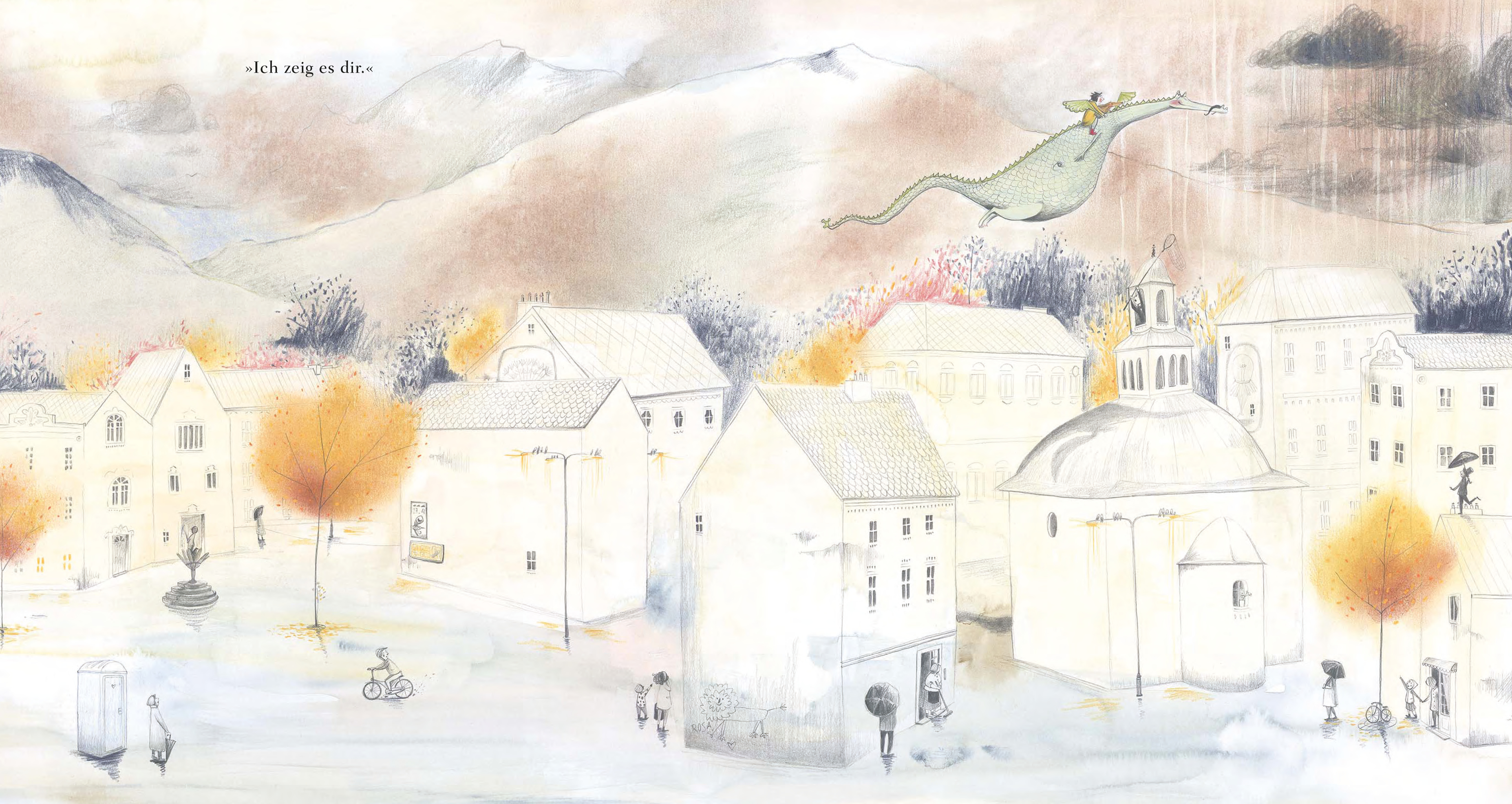 Was gibt es Schöneres als einen Regentag auf dem Sofa? Toni macht es sich gerade gemütlich, als der Drache Fred hereinspaziert kommt. Er ist Tonis Freund ... und er muss mal. Aber Tonis Klo ist zu klein. Was tun? Toni macht Vorschläge, die für einen Drachen mit Stil aber nicht infrage kommen. Allmählich wird es eilig. Kurzerhand fliegt Fred mit Toni ins Drachenland, wo wunderschöne schwimmende Pagoden warten ...Julie Völks atmosphärische Bilder sind nicht nur eine Hommage an behagliche Regentage. Die Künstlerin erzählt ein sagenhaftes Drachenabenteuer und beleuchtet zugleich mit Sensibilität ein wichtiges Thema mit viel Verständnis für die Nöte, die nicht nur Drachen auf der Suche nach einem Örtchen haben können.