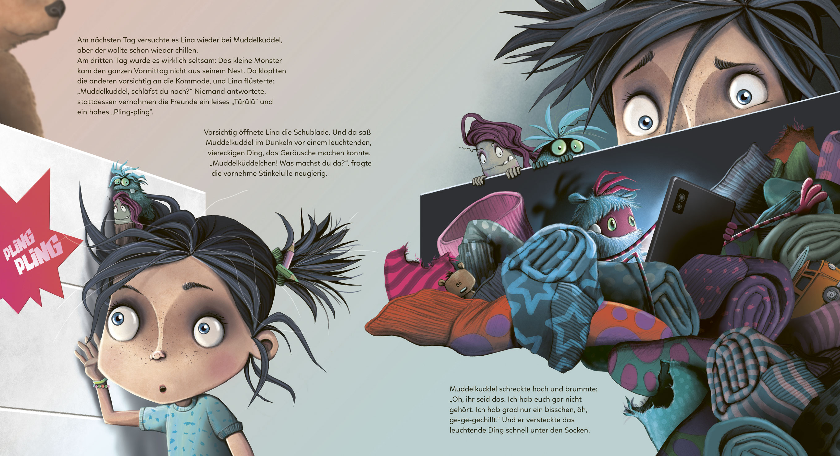 Muddelkuddel, Stauberich und Stinkelulle - das sind drei kleine Monster, die bei Lina im Kinderzimmer wohnen. Doch eines Tages hat Muddelkuddel auf einmal keine Lust mehr, mit seinen Freunden zu spielen. Er versteckt sich in seiner Schublade und starrt nur noch auf ein leuchtendes, viereckiges Ding, auf dem er stundenlang herumdrücken und wilde Spiele machen kann. Ob das dem kleinen Muddelkuddel auf Dauer guttut?