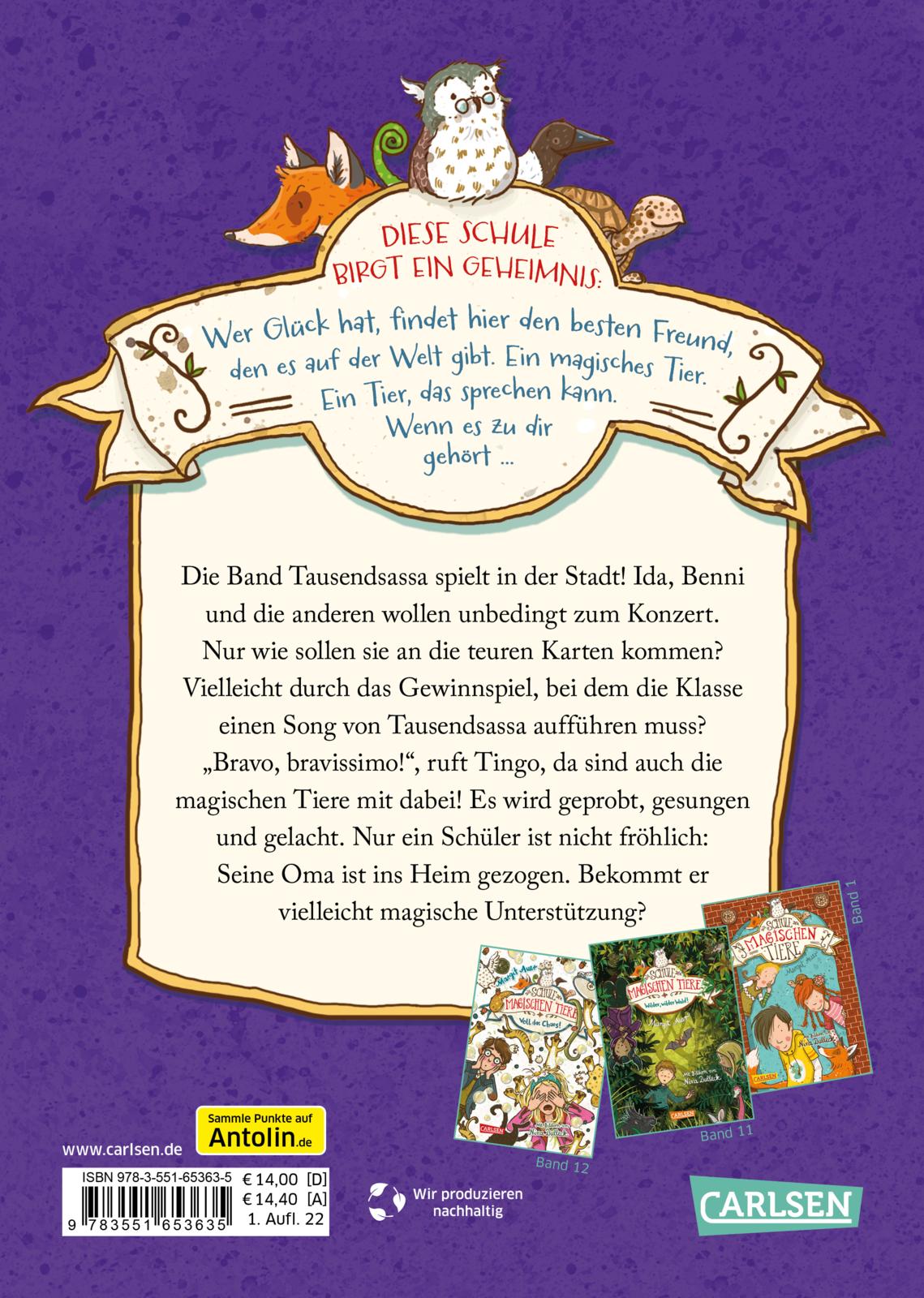 BAND 13: Es ist einiges los in der Wintersteinschule: Die Band Tausendsassa gibt ein Konzert in der Stadt! Es ist ja wohl klar, dass Ida, Benni und die anderen unbedingt dabei sein wollen. Aber wie sollen sie an die teuren Karten kommen? Die Freunde schmieden wilde Pläne: Vielleicht können sie die Karten gewinnen? Es gibt einen Wettbewerb, bei dem die Klasse einen Song von Tausendsassa aufführen muss. "Bravo, bravissimo!", ruft Tingo, da sind die magischen Tiere mit dabei! Es wird geprobt, gesungen und gelacht. Nur ein Schüler ist nicht fröhlich: Seine Oma ist ins Heim gezogen. Bekommt er vielleicht magische Unterstützung?