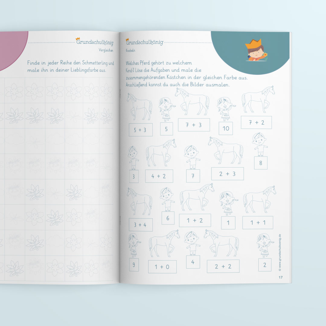 In dem Heft findet Ihr Übungen zum ersten Rechnen, Vervollständigen von Mustern und Reihen, Konzentrationsübungen wie Fehlerbilder, Zahlensuchen, Bilder zum Knobeln und Entdecken sowie viele Bilder, die zum Ausmalen einladen.