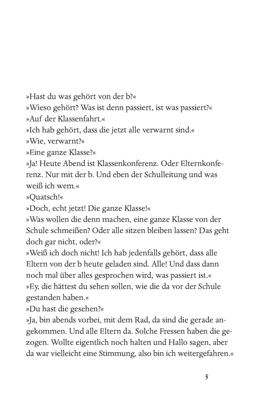 Irgendetwas ist schrecklich schiefgegangen auf der Klassenfahrt der 10b. Das sagen zumindest die anderen. Und dass es deshalb heute Abend eine Klassenkonferenz mit ALLEN Eltern gibt. Aber keiner weiß, was genau passiert ist. Eine Art Machtkampf zwischen Schülern und Lehrern. Ob in dem Protokoll mehr steht? Und ob wirklich eine ganze Klasse von der Schule geschmissen werden kann?