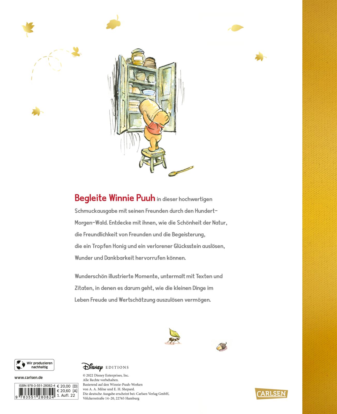 Begleite Winnie Puuh in dieser schönen Schmuckausgabe durch einen Tag im Hundert-Morgen-Wald. Entdecke mit ihm, wie die Schönheit der Natur, die Freundlichkeit von Freunden und die Freude, die ein Tropfen Honig einem hungrigen Bären Freude bereitet, Wunder und Dankbarkeit hervorrufen können. Wunderschön illustrierte Momente, untermalt mit Texten und Zitaten sowie einfachen Erklärungen, wie die kleinen Dinge in unserem Leben Freude und Wertschätzung auslösen können.