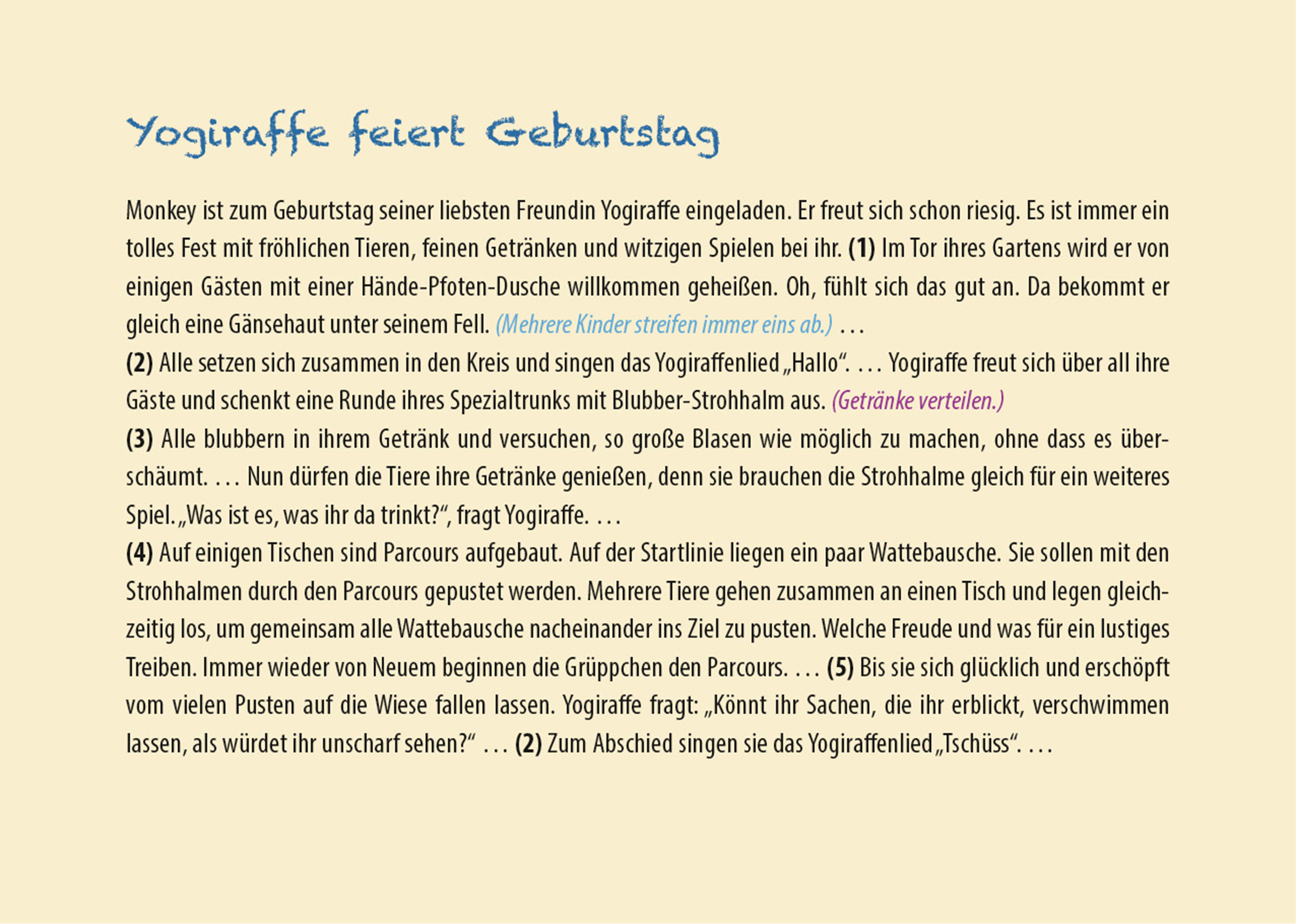 | Schlagworte | Atemübung • Atmen • Bewegung • Entspannung • Entspannungsübungen • Fantasiereise • Geschichte • Gesundheit • Grundschule • Hort • Kinder • Kindergarten • Kita • Meditation • Pädagogische Fachkraft • Resilienz • Schulkindbetreuung • Sinne • Sinneswahrnehmung • Traumreise • Wohlbefinden • Yoga |