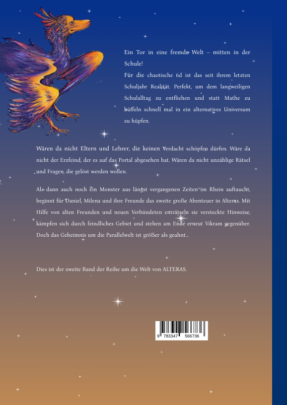 Ein Tor in eine fremde Welt - mitten in der Schule! Für die chaotische 6d ist das seit ihrem letzten Schuljahr Realität. Perfekt, um dem langweiligen Schulalltag zu entfliehen und statt Mathe zu büffeln schnell mal in ein alternatives Universum zu hüpfen. Wären da nicht Eltern und Lehrer, die keinen Verdacht schöpfen dürfen. Wäre da nicht der Erzfeind, der es auf das Portal abgesehen hat. Wären da nicht unzählige Rätsel und Fragen, die gelöst werden wollen.Als dann auch noch ein Monster aus längst vergangenen Zeiten im Rhein auftaucht, beginnt für Daniel, Milena und ihre Freunde das zweite große Abenteuer in Alteras. Mit Hilfe von alten Freunden und neuen Verbündeten enträtseln sie versteckte Hinweise, kämpfen sich durch feindliches Gebiet und stehen am Ende erneut Vikram gegenüber. Doch das Geheimnis um die Parallelwelt ist größer als geahnt...