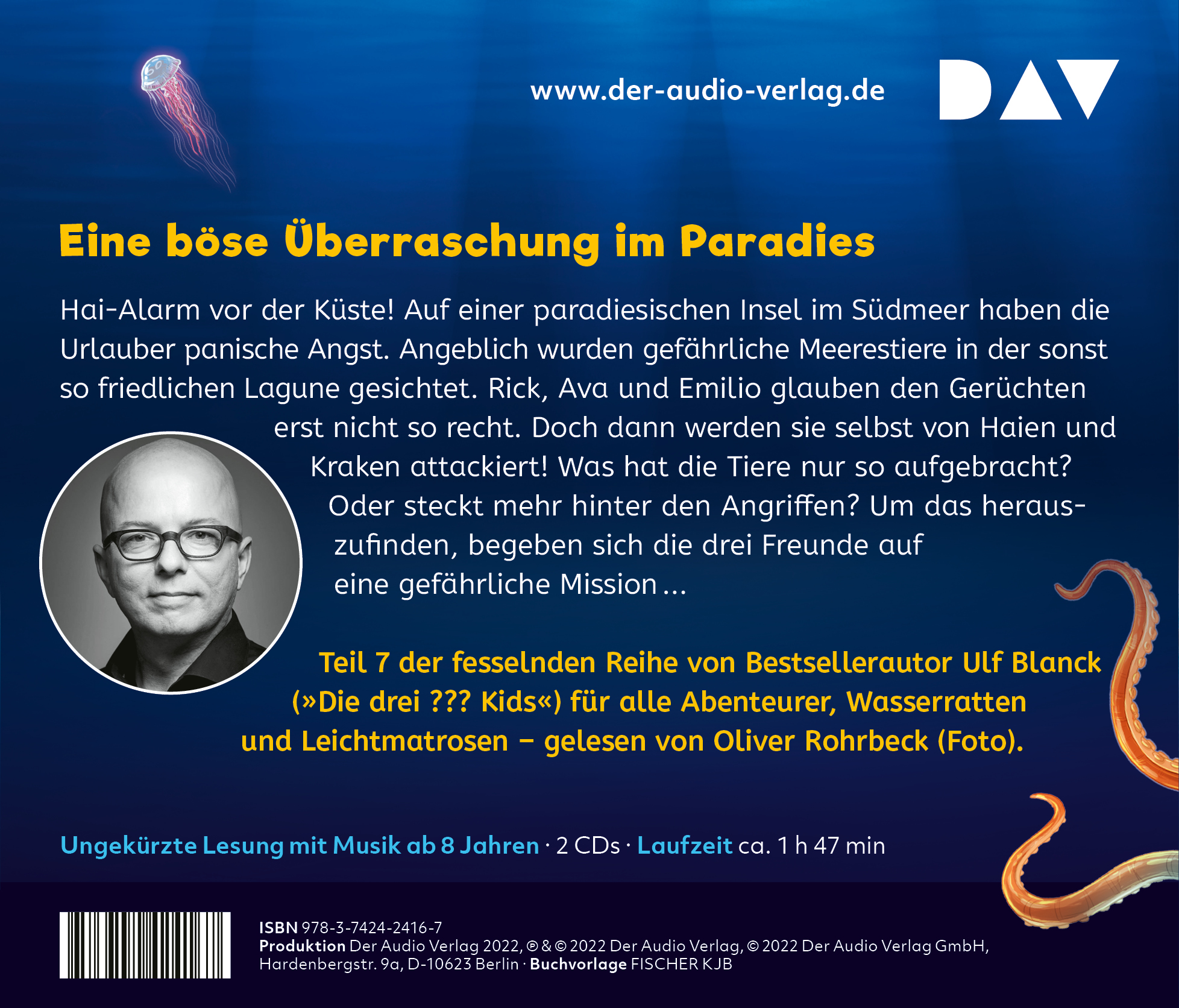 Hai-Alarm vor der Küste! Die Urlauber auf der paradiesischen Insel im Südmeer haben panische Angst. Rick, Ava und Emilio glauben erst nicht so recht an die Gerüchte. Doch dann werden sie selbst von Haien und Kraken attackiert! Was hat die Tiere so aufgebracht? Oder steckt mehr hinter den Angriffen? Die drei Freunde begeben sich auf eine gefährliche Mission. Teil 7 der spannenden Reihe von Bestsellerautor Ulf Blanck (»Die drei ??? Kids«) für Abenteurer, Wasserratten und Leichtmatrosen - ungekürzt gelesen von Oliver Rohrbeck.Ungekürzte Lesung mit Musik mit Oliver Rohrbeck2 CDs | ca. 1 h 47 min